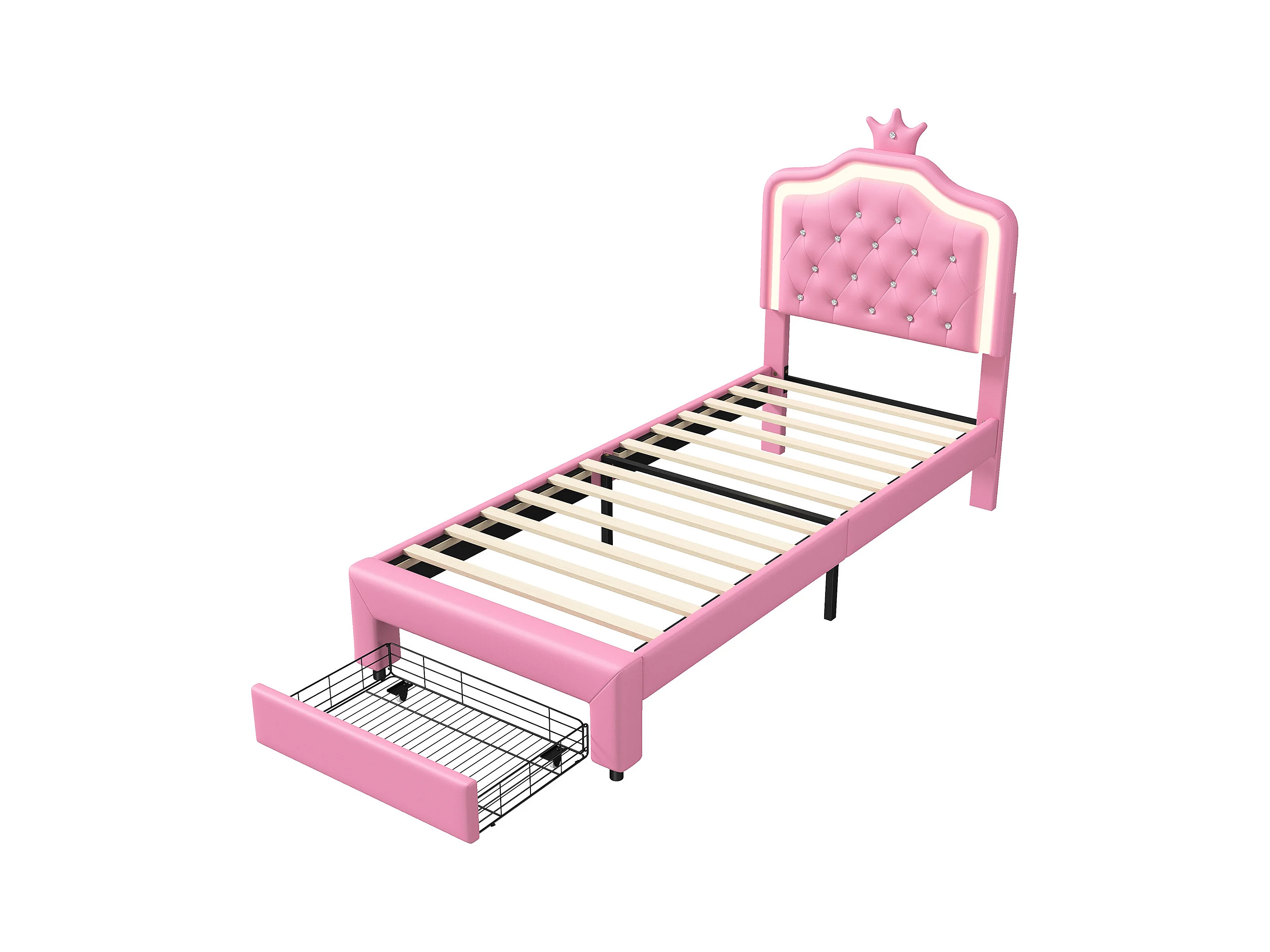Letto imbottito 90 x 200 cm, con cassetti, LED, con rete a doghe e schienale, rosa