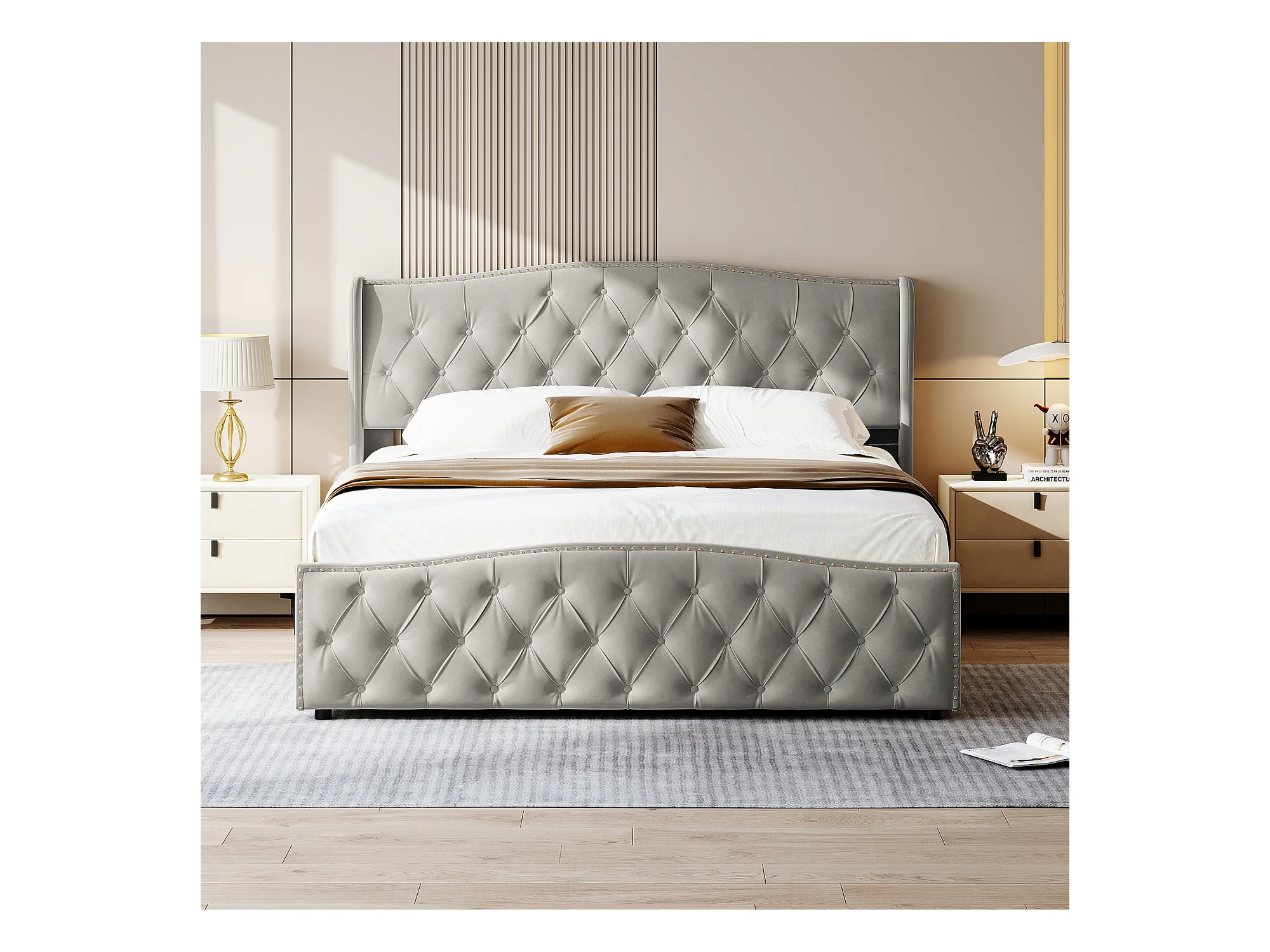 Letto 160 x 200 con cassetti, Letto imbottito con LED e USB Struttura letto matrimoniale Letto per adulti, Grigio