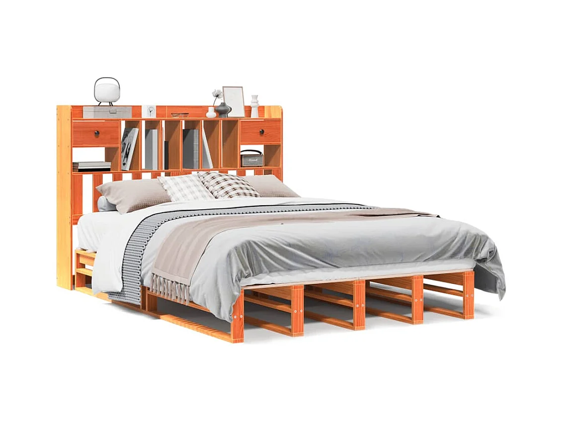 Letto libreria senza materasso, cera marrone, 160x200 cm, pino massiccio