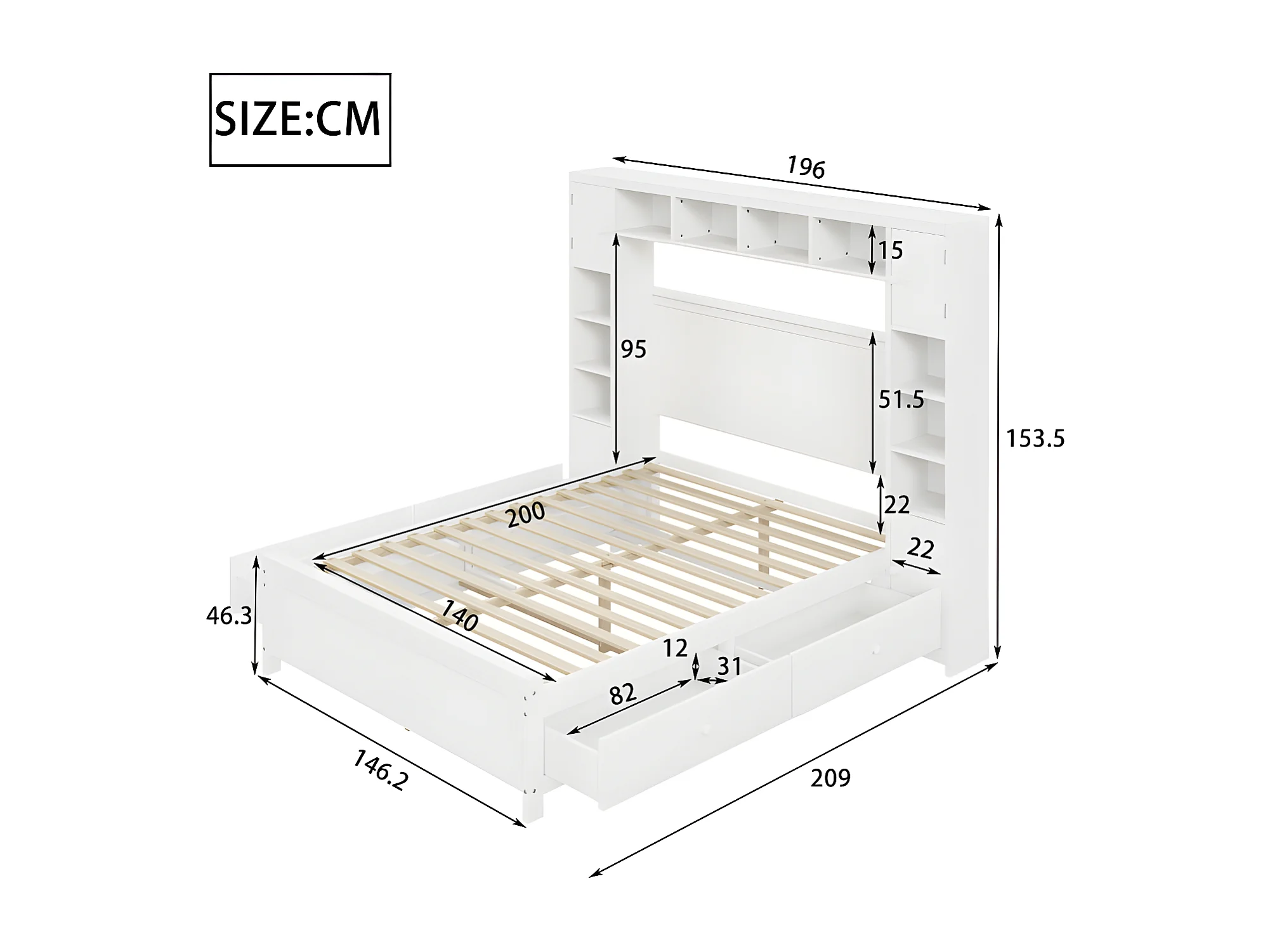 Letto matrimoniale 140x200 cm - con 4 cassetti e ampia testiera contenitore - legno massello - Bianco
