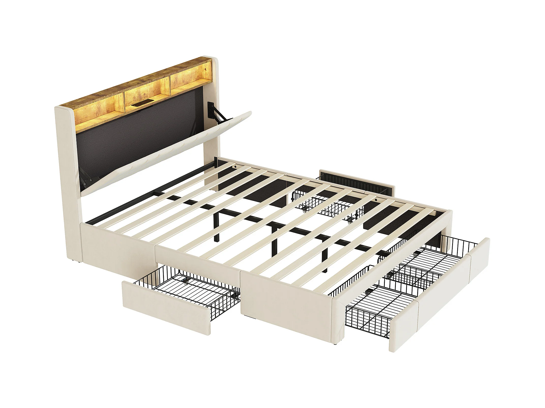 Letto matrimoniale 160x200 cm con contenitore, LED, comodino con porta di ricarica USB, velluto, beige