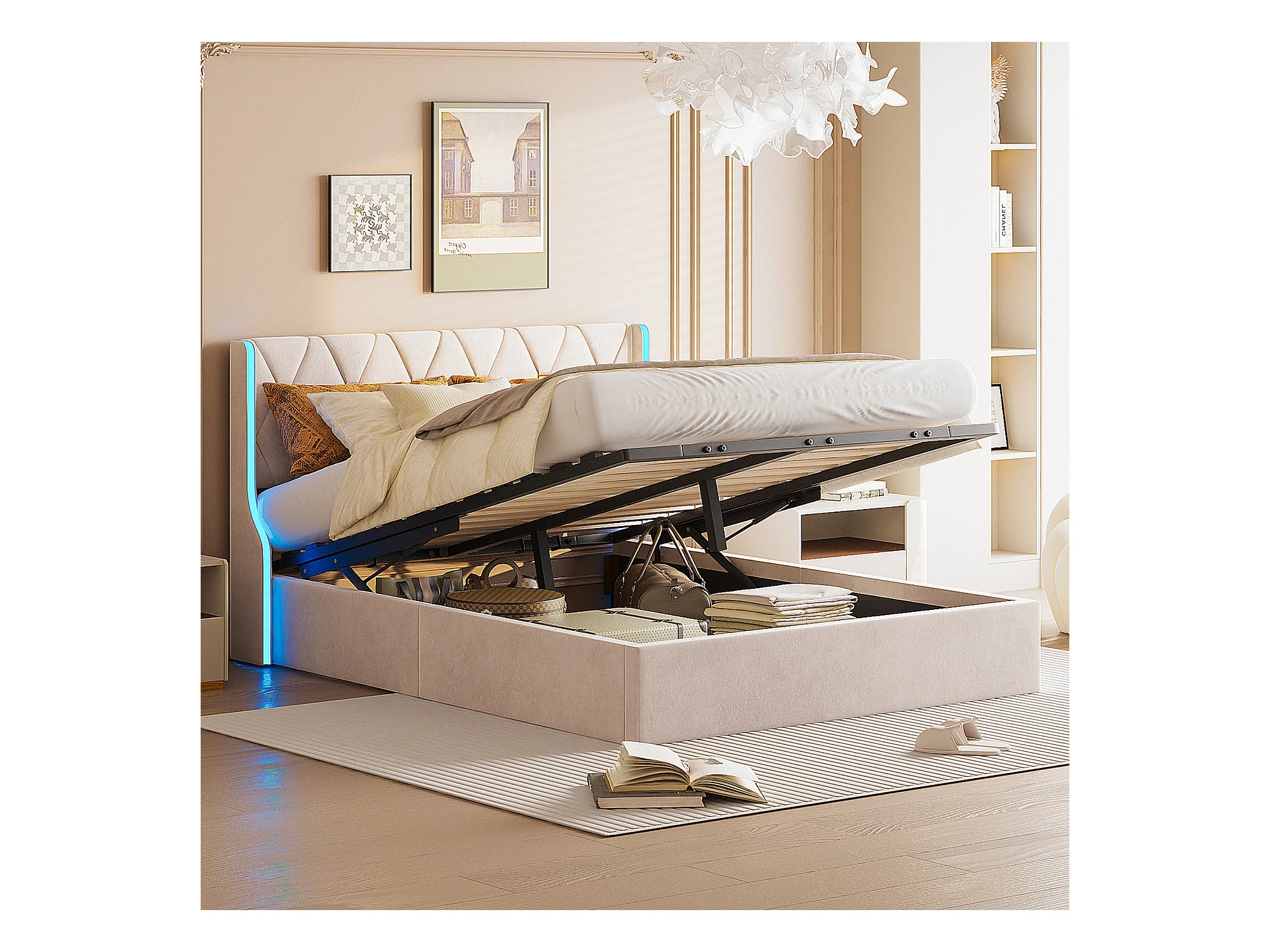 Letto matrimoniale 140x200 cm con contenitore idraulico – Rivestimento in velluto grigio, illuminazione a LED