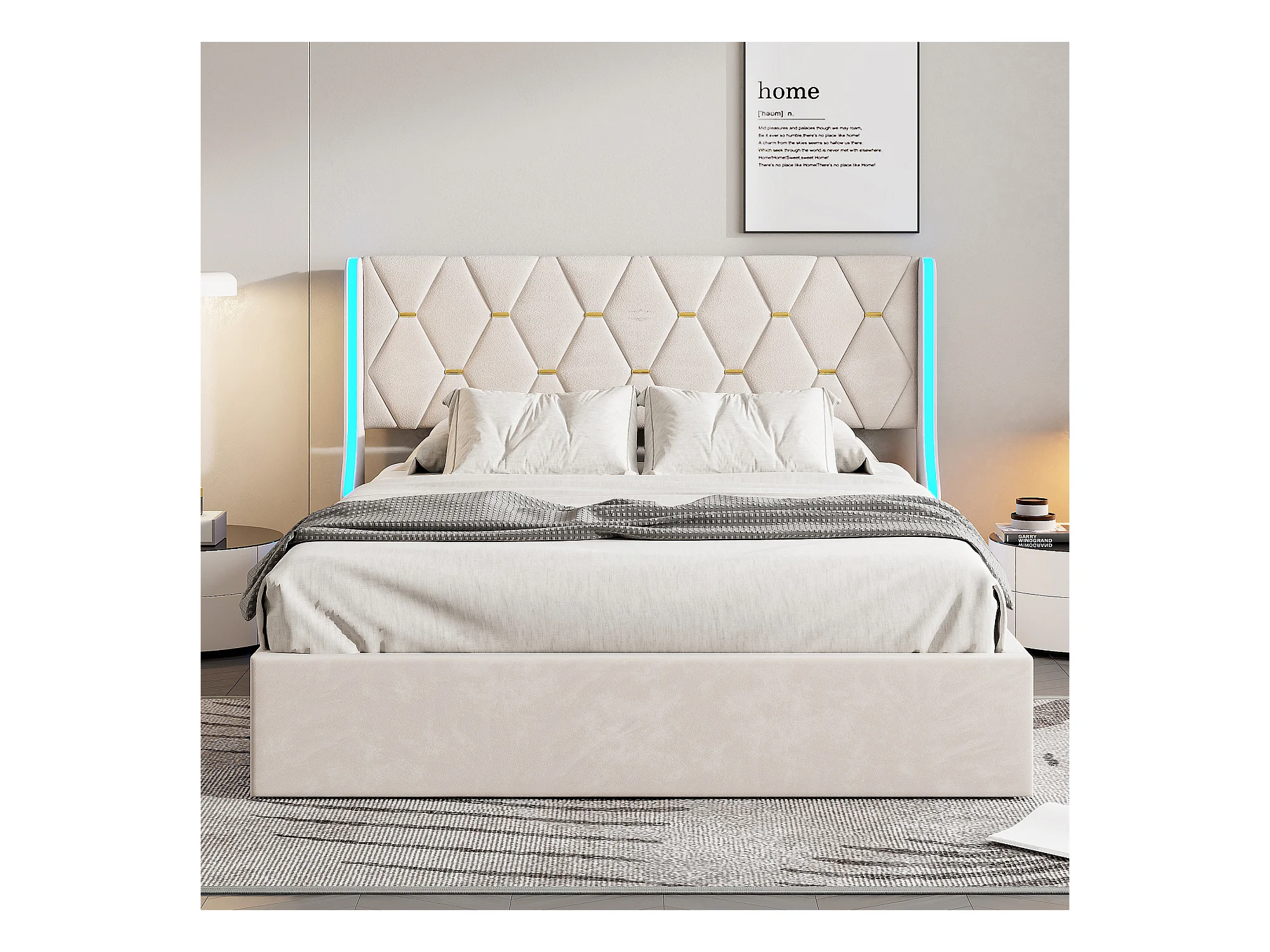 Letto matrimoniale 140x200, illuminazione a LED, contenitore sottoletto, schienale morbido, portata 300 kg, velluto, grigio