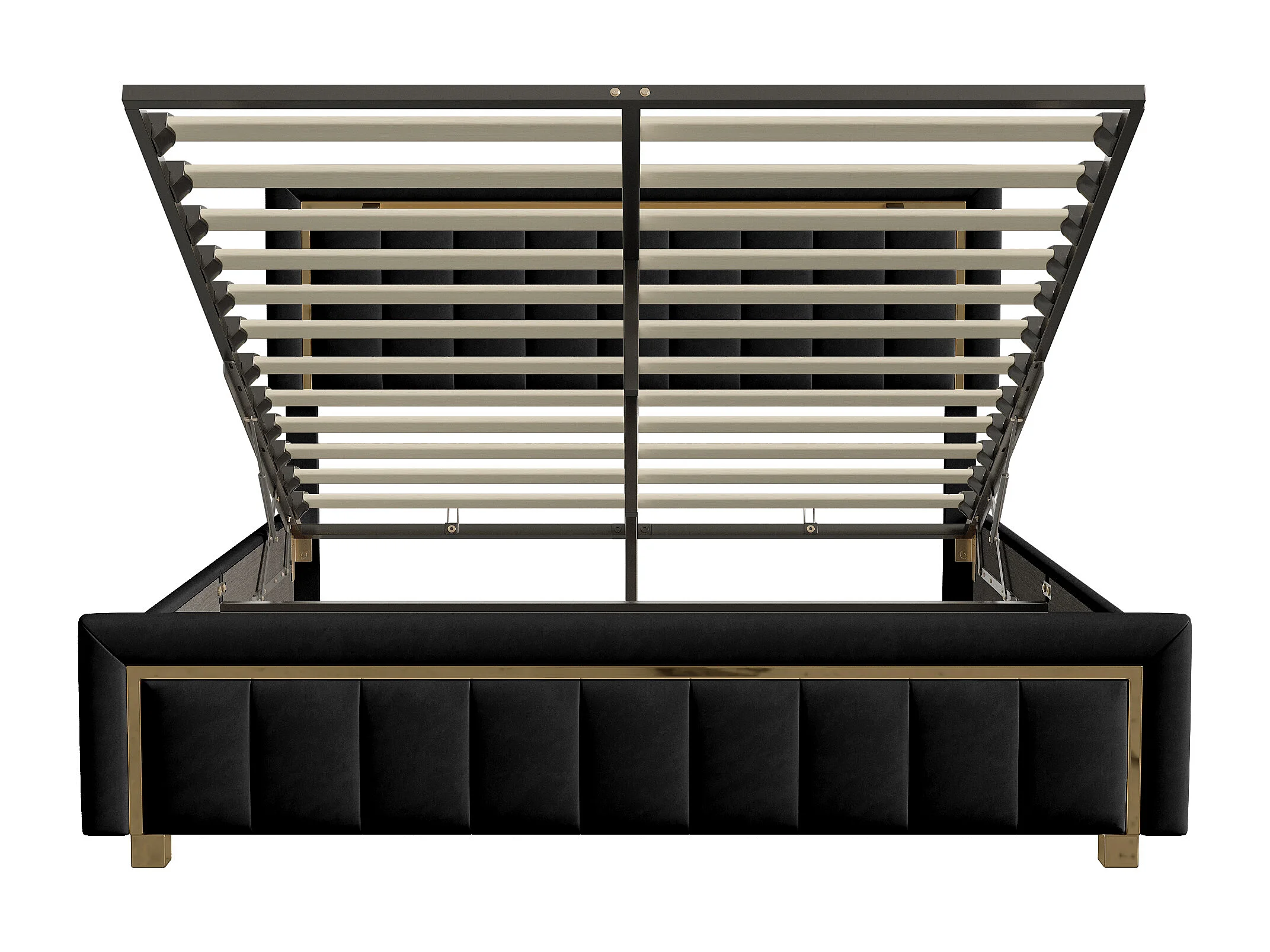 Letto contenitore 140x200 cm con testiera e rete a doghe, con contenitore idraulico sotto il letto, bordi verticali dorati, nero