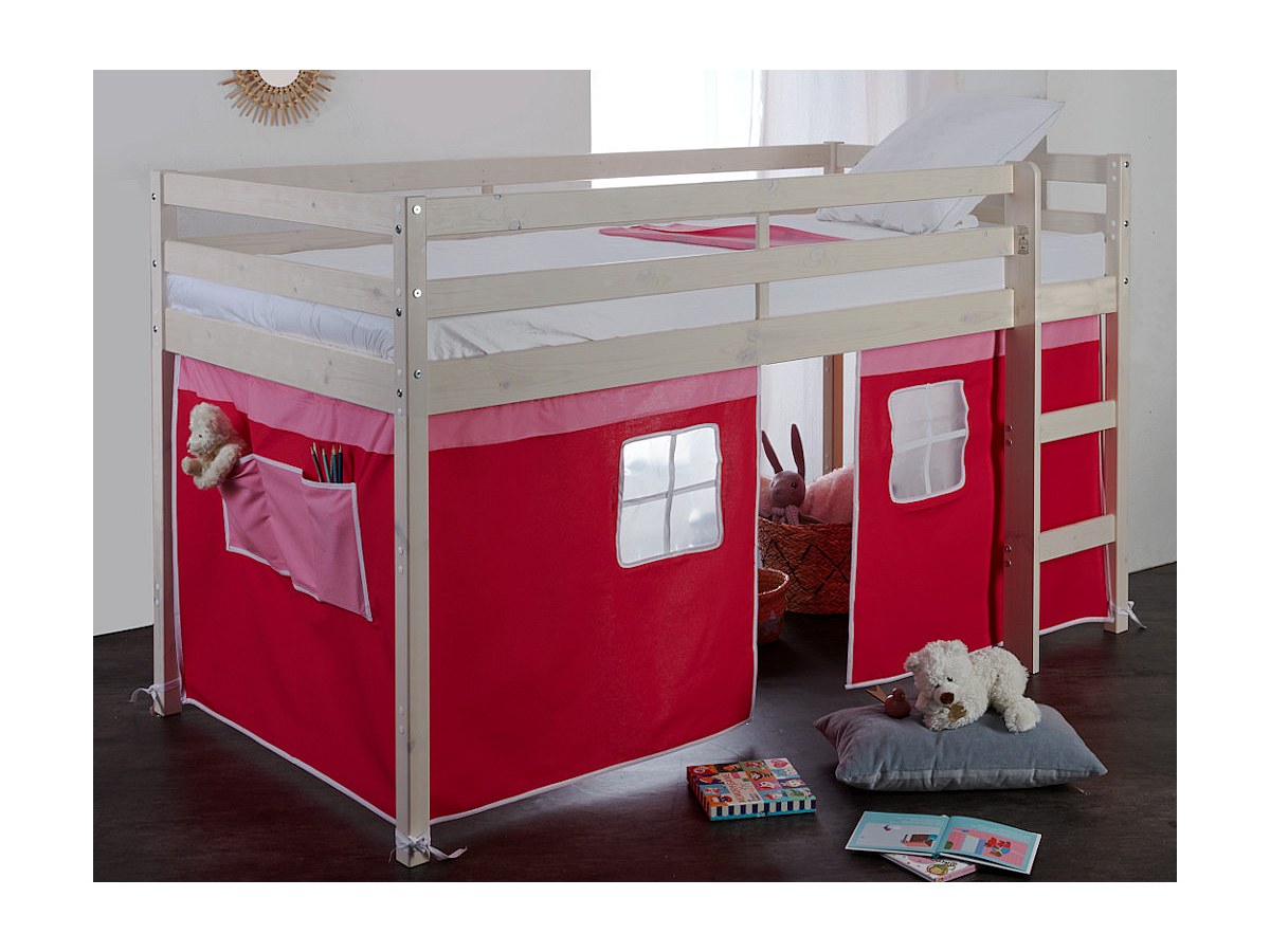 Letto mezza altezza 90 x 190 cm Tende Rosse e Rosa Abete massello - LILIO