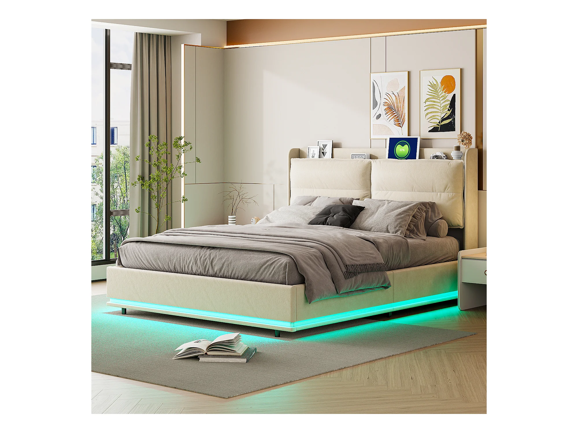Letto moderno rettangolare 160x200 cm con rete a doghe, imbottito, USB e Type-C, contenitore, beige