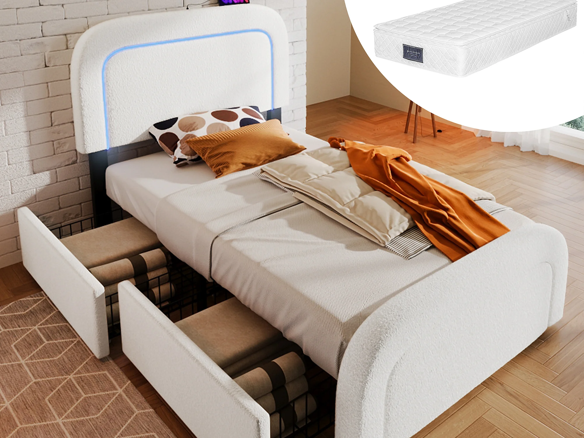 Letto per adulti 160 x 200 cm con 2 cassetti e testiera regolabile - USB + Type C - Tessuto Sherpa - bianco + Materasso