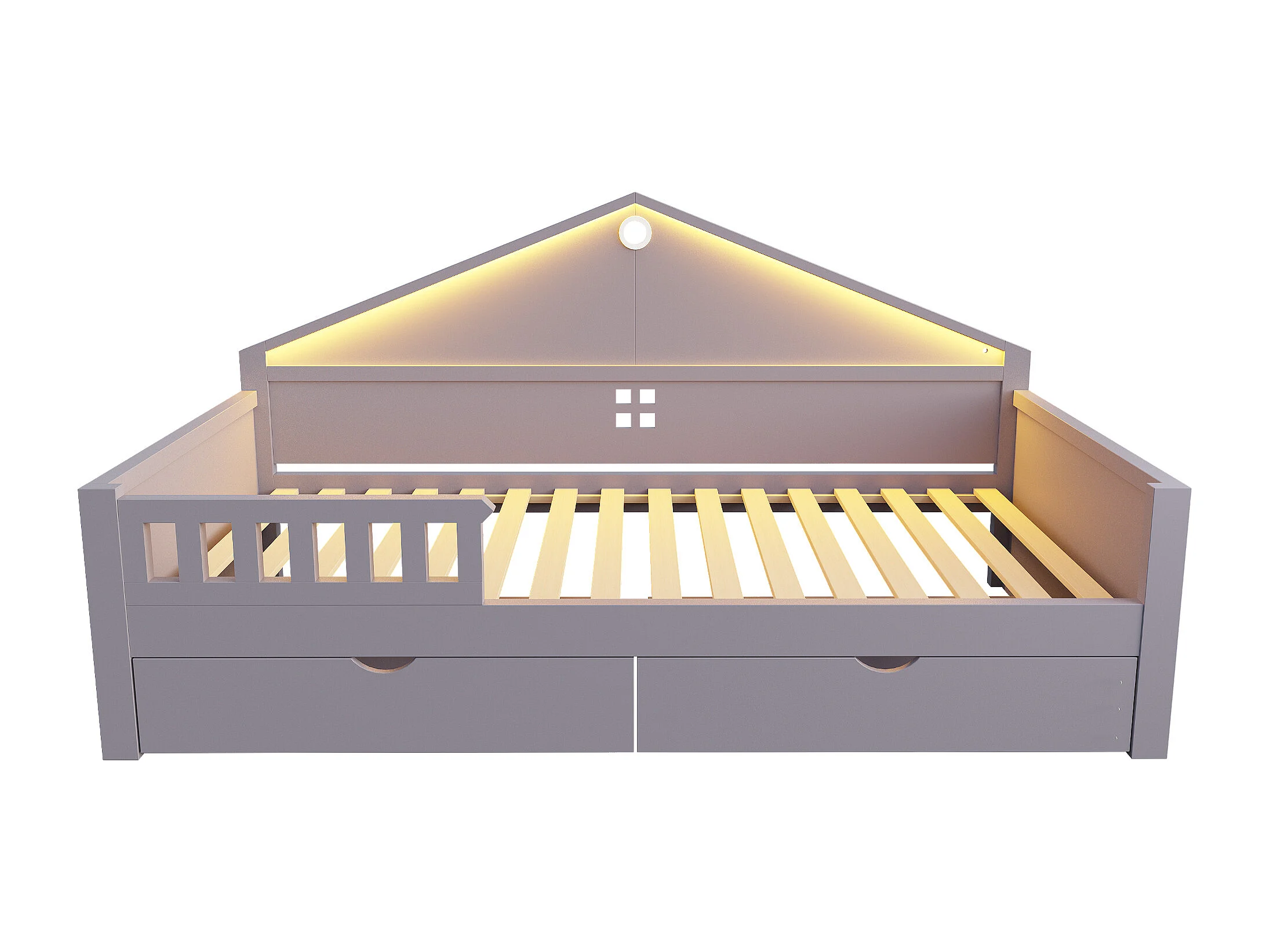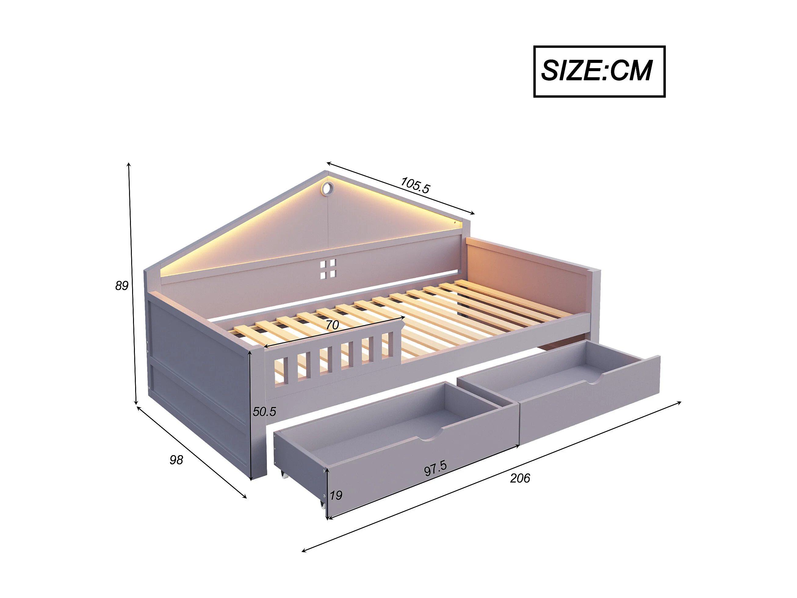 Letto singolo per bambini - 90 x 200 cm - con LED + 2 cassetti + rete a doghe - legno + MDF - grigio