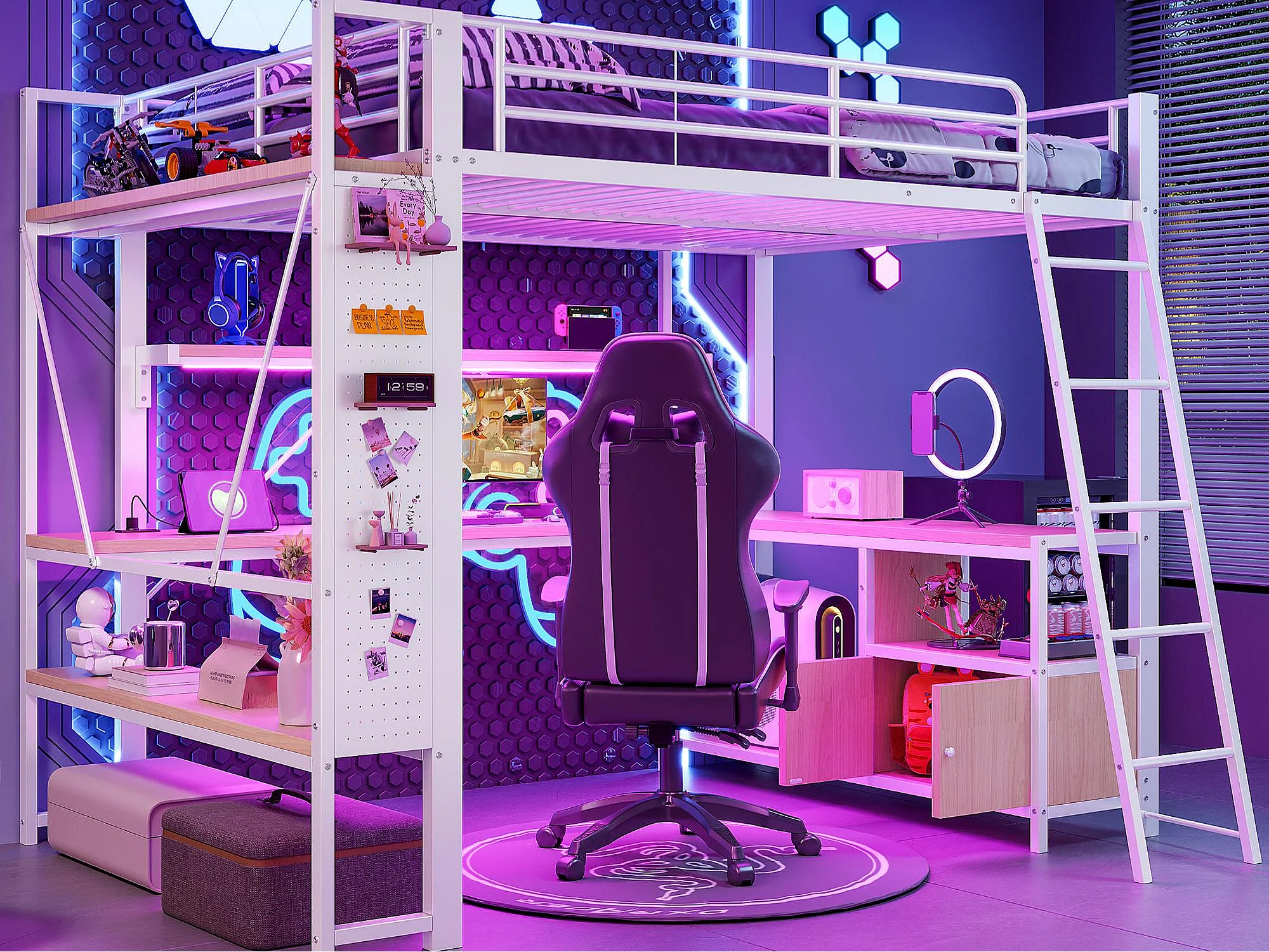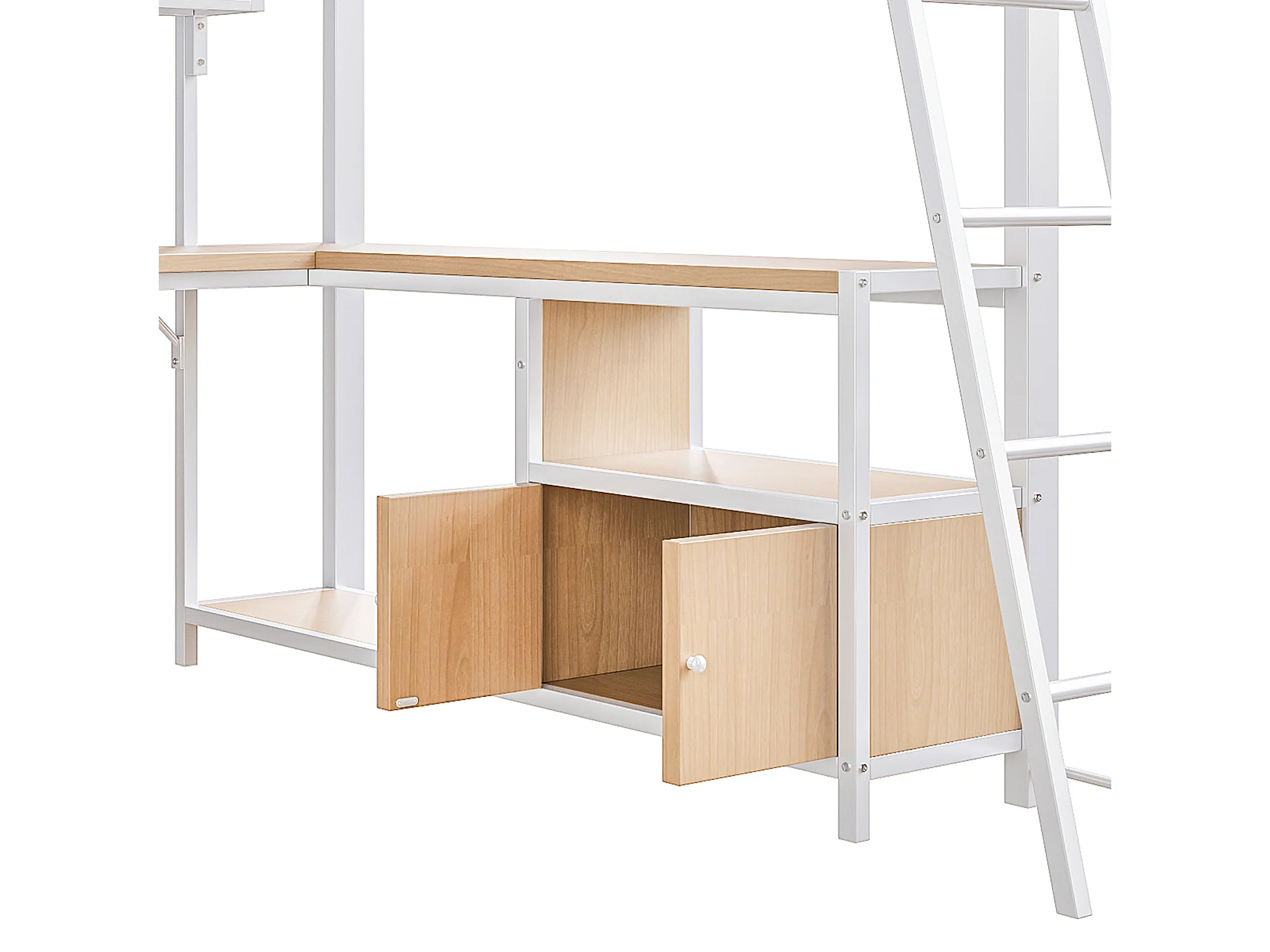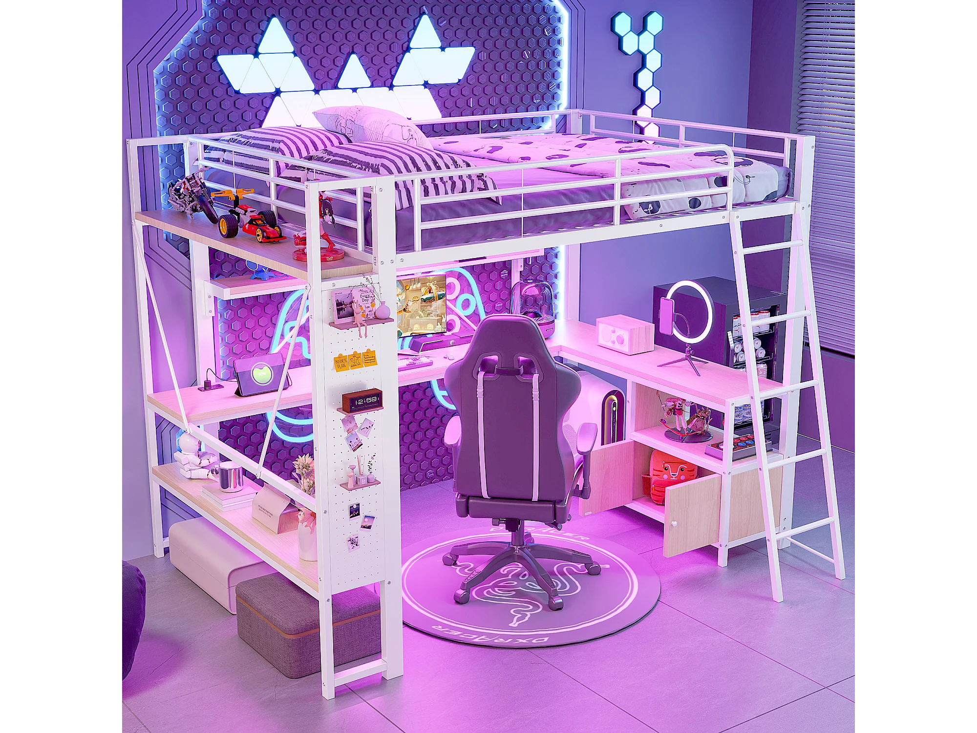 Letto soppalcato 140x200 cm - Struttura in ferro - Illuminazione LED - Scrivania con ripiano - Porta USB - Bianco (materasso non incluso)