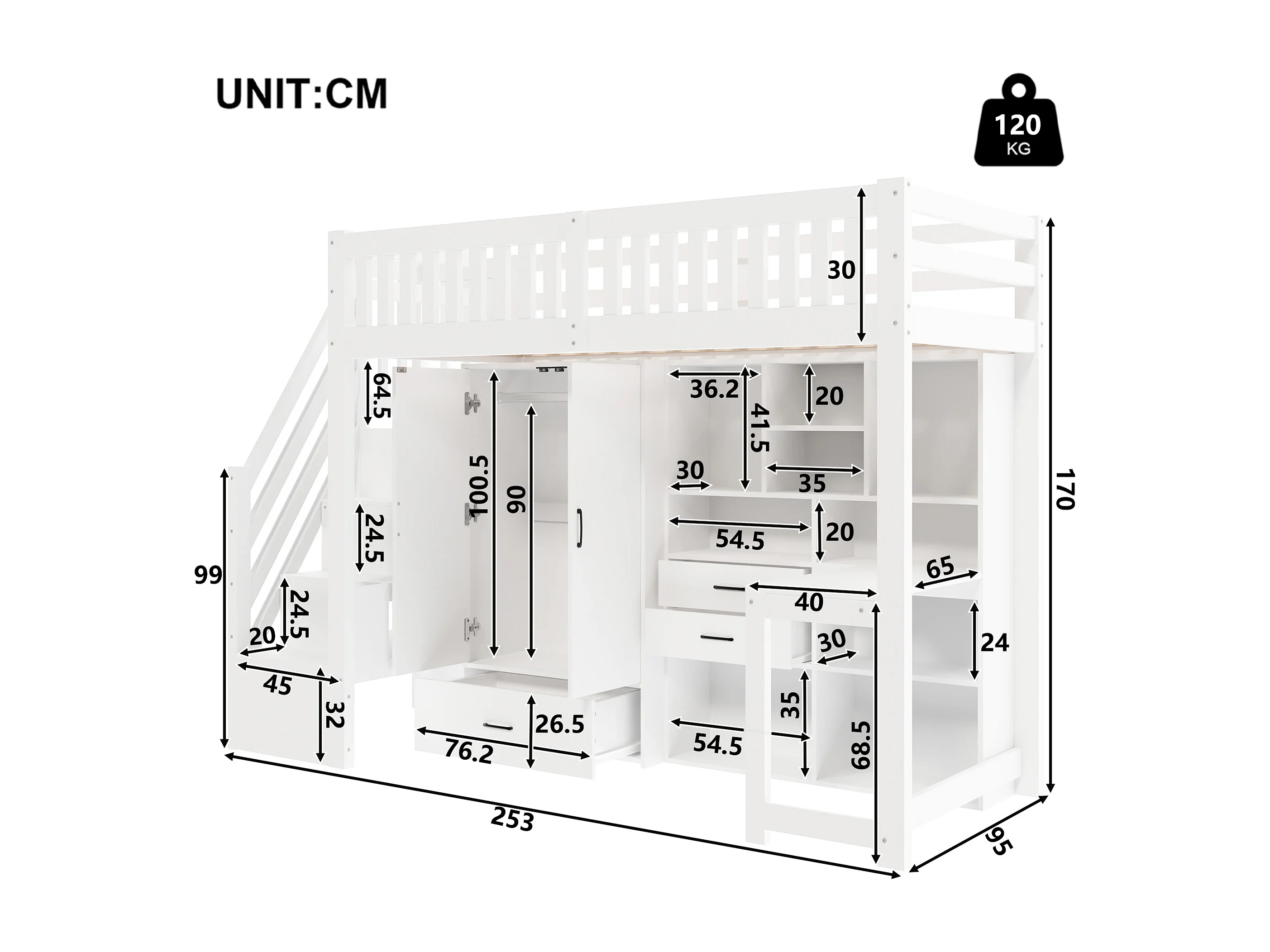 Letto soppalcato 90x200cm - con scala di riporre - con armadio - con scrivania - con 3 cassetti + scomparti di riporre - bianco