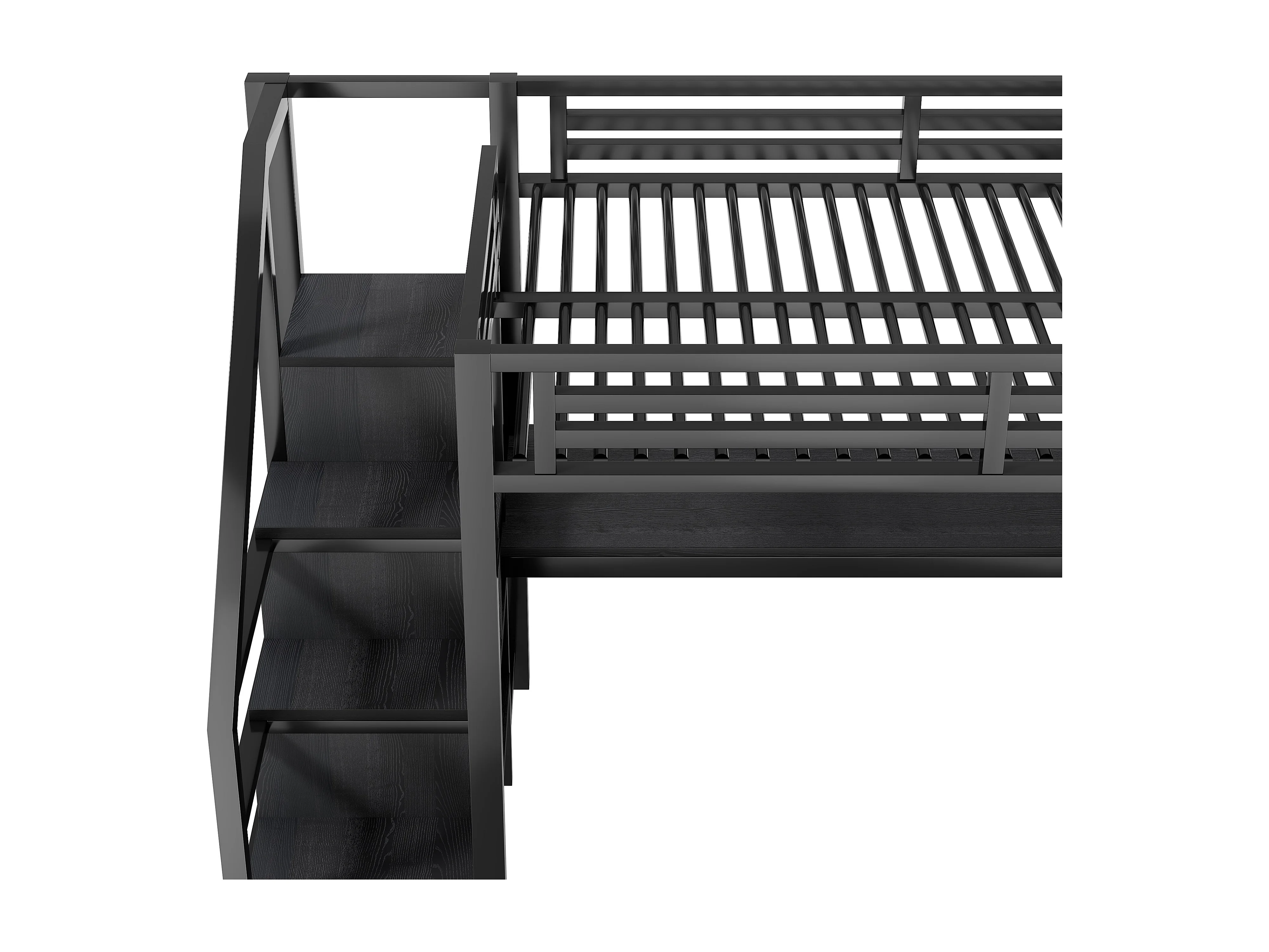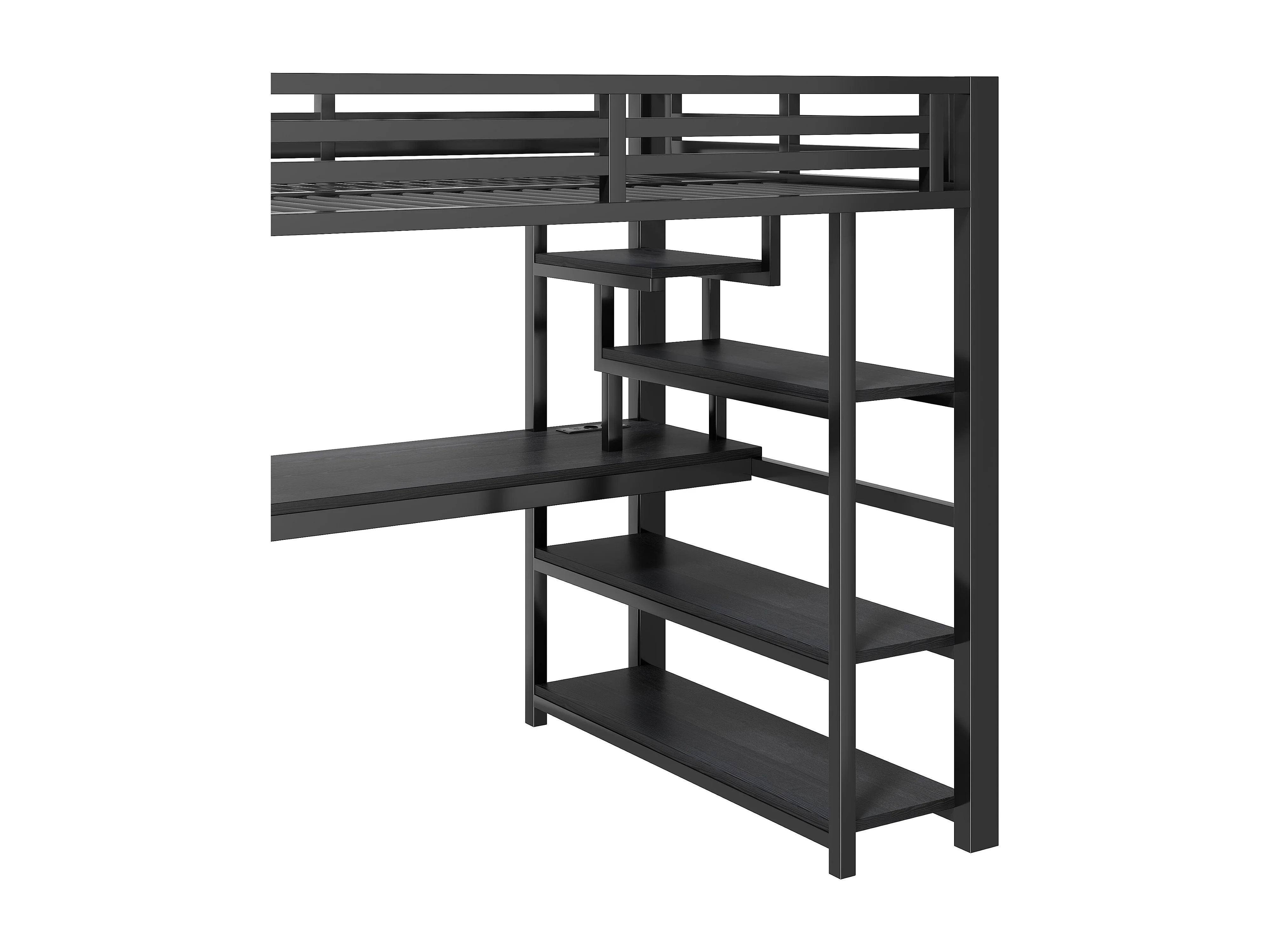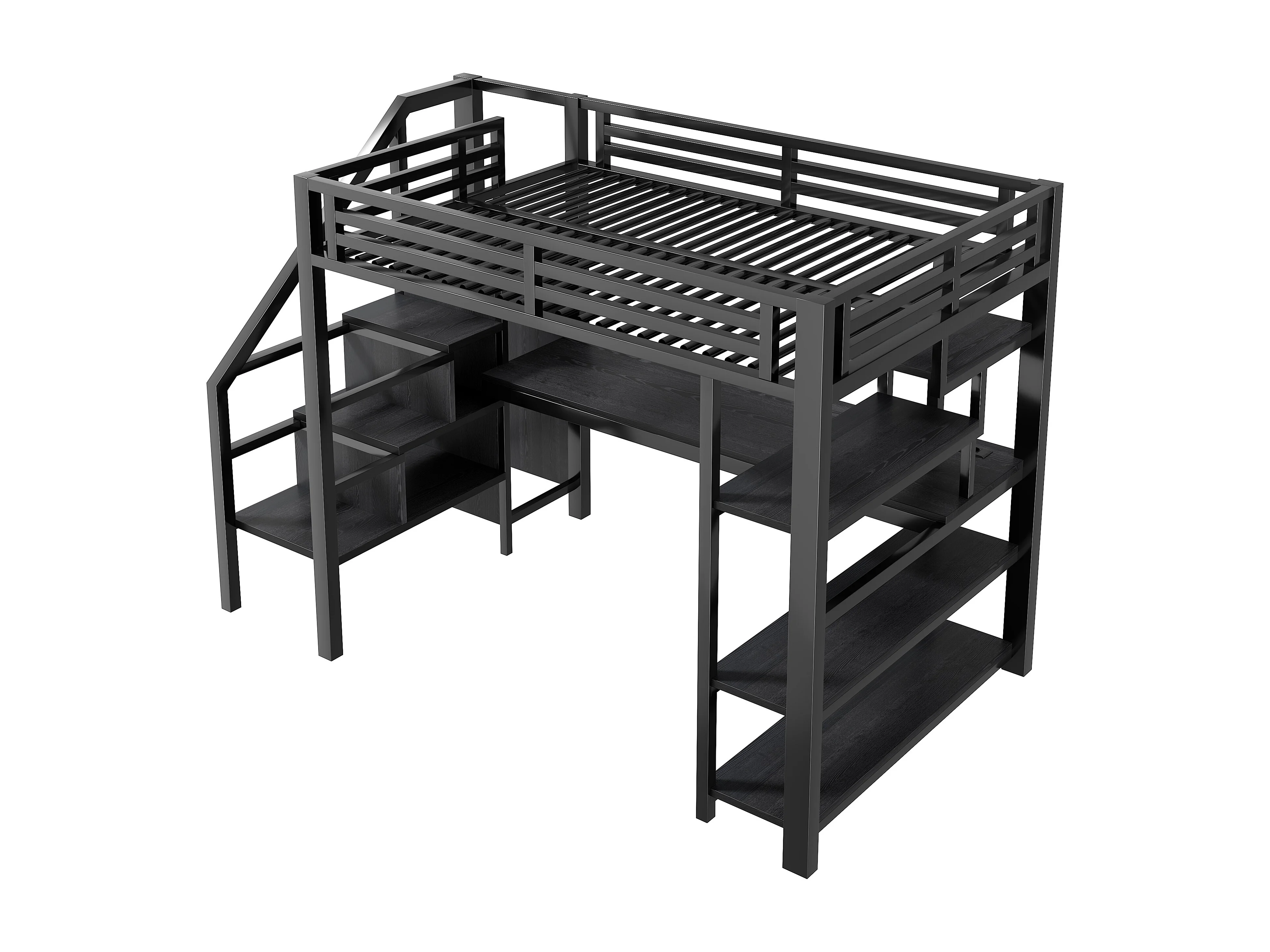 Letto soppalcato in metallo 140x200cm - con armadio aperto e scrivania - LED e porta USB - con scala di riporre e ripiani - Nero
