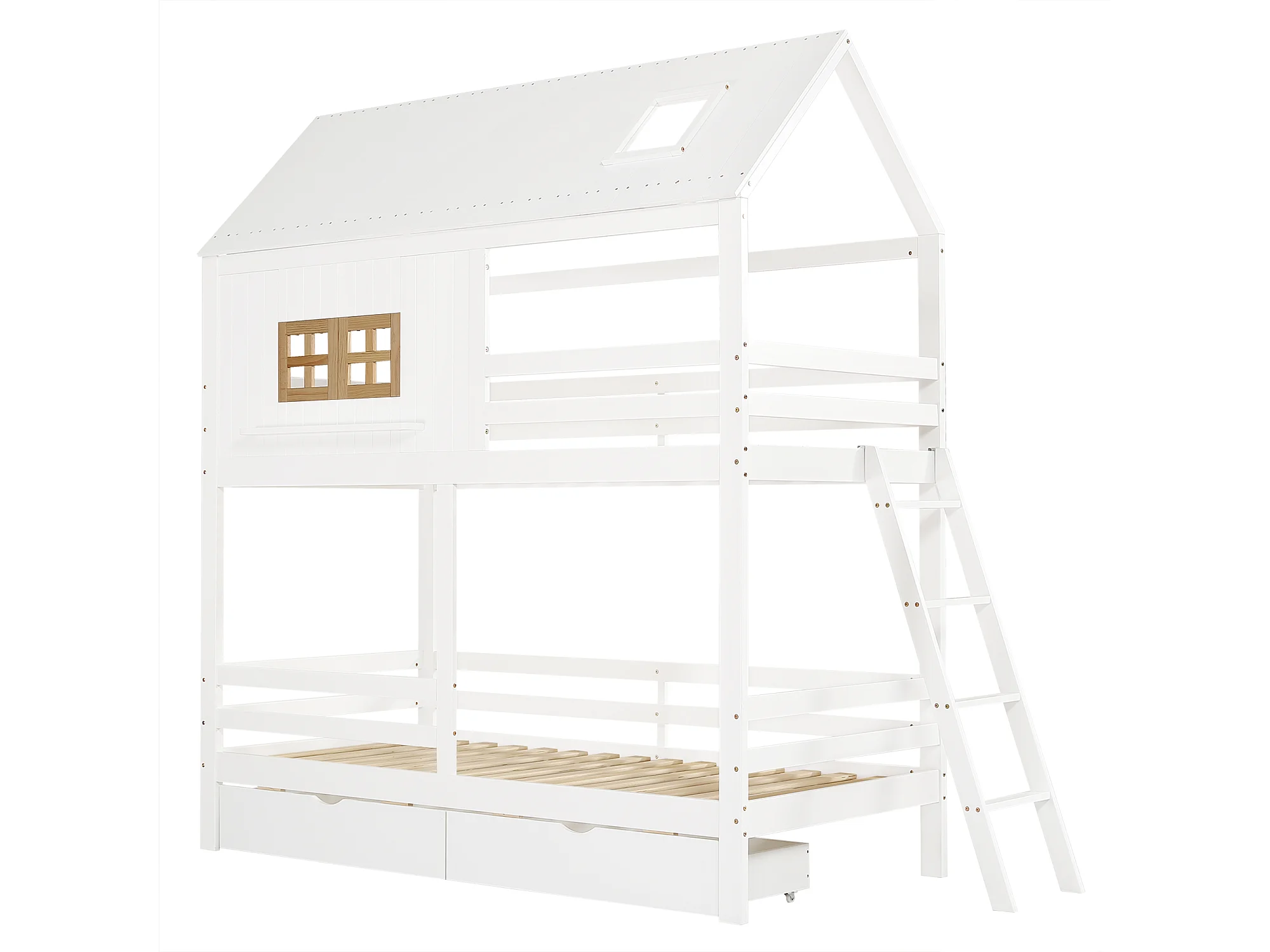 Letto sovrapposto per bambini 90x200 cm - con finestra - con 2 cassetti - con scala - legno massello - bianco + naturale (senza materasso)