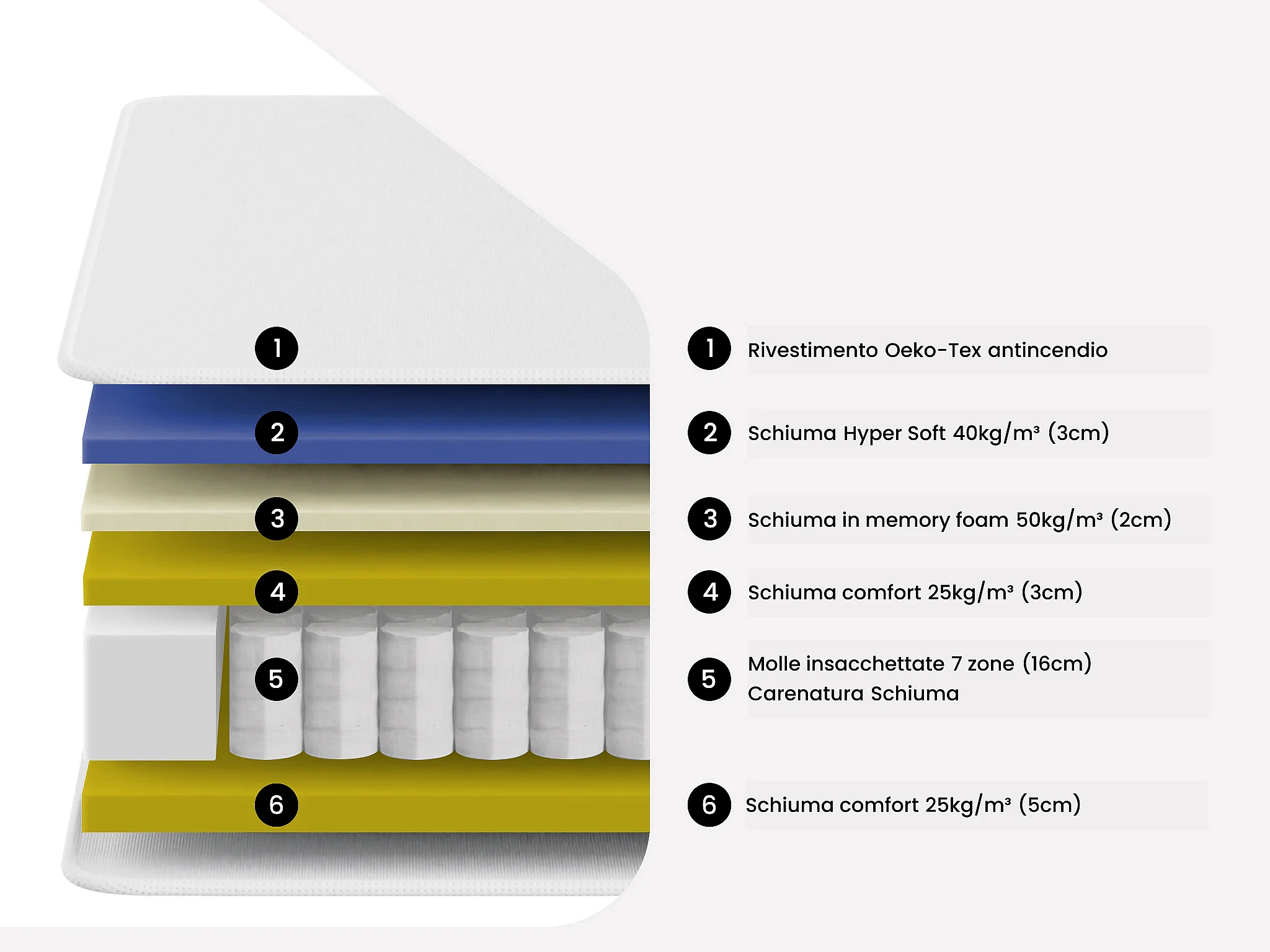 Materasso 180 x 200 cm ignifugo molle insacchettate 7 zone e memory foam sp. 29 cm - SIVA di YSMÉE