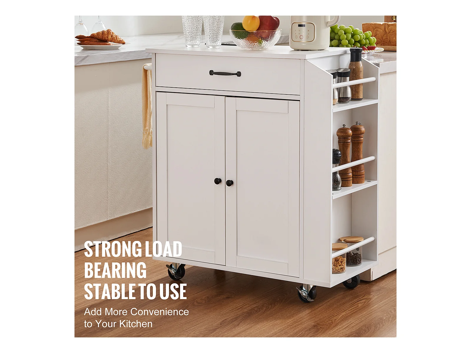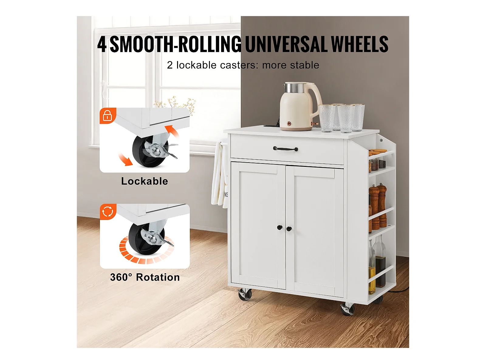 Isola da cucina su ruote con portaspezie cassetto grande armadietto a 2 porte, Carrello da cucina rotante Bianco