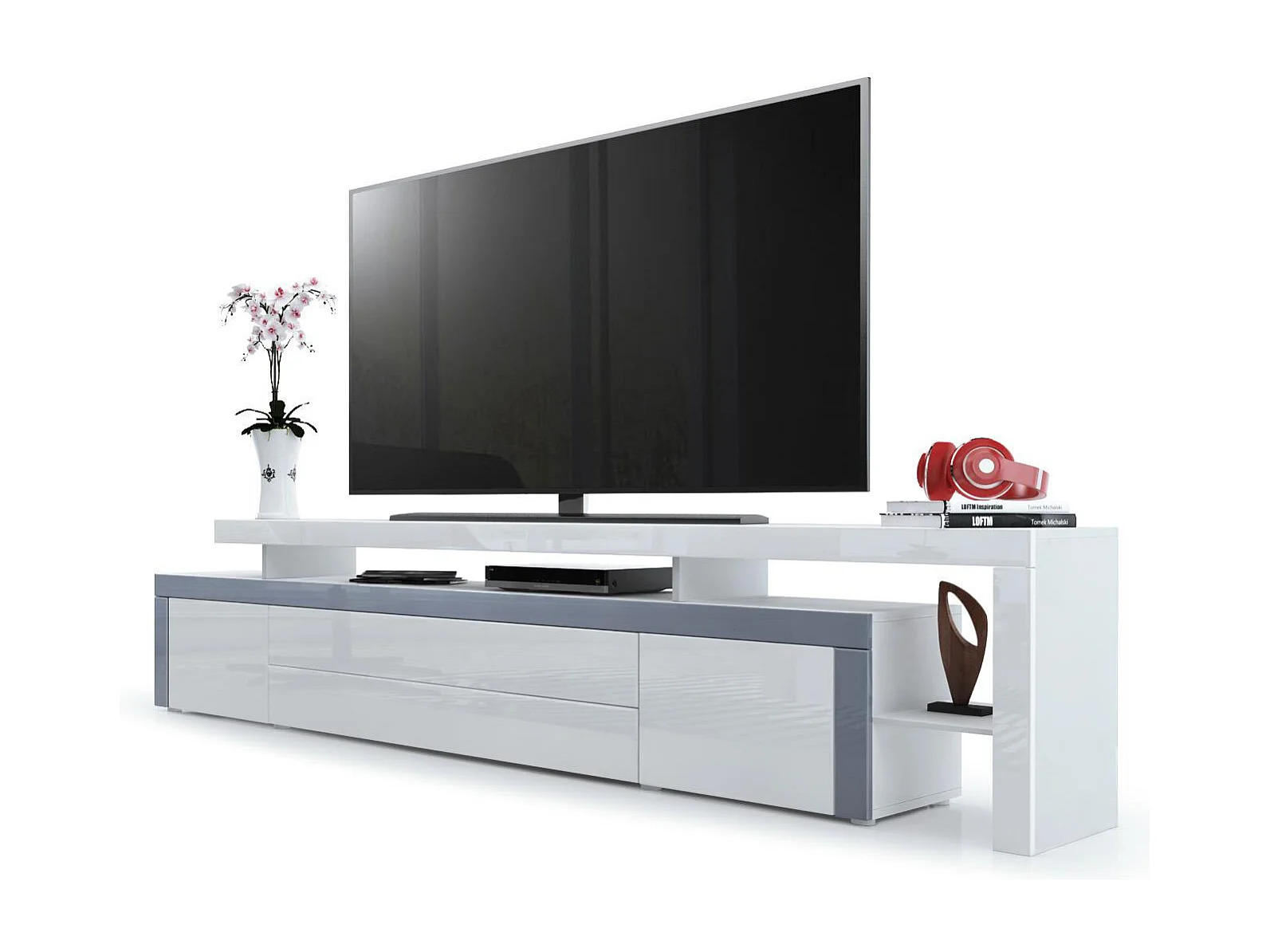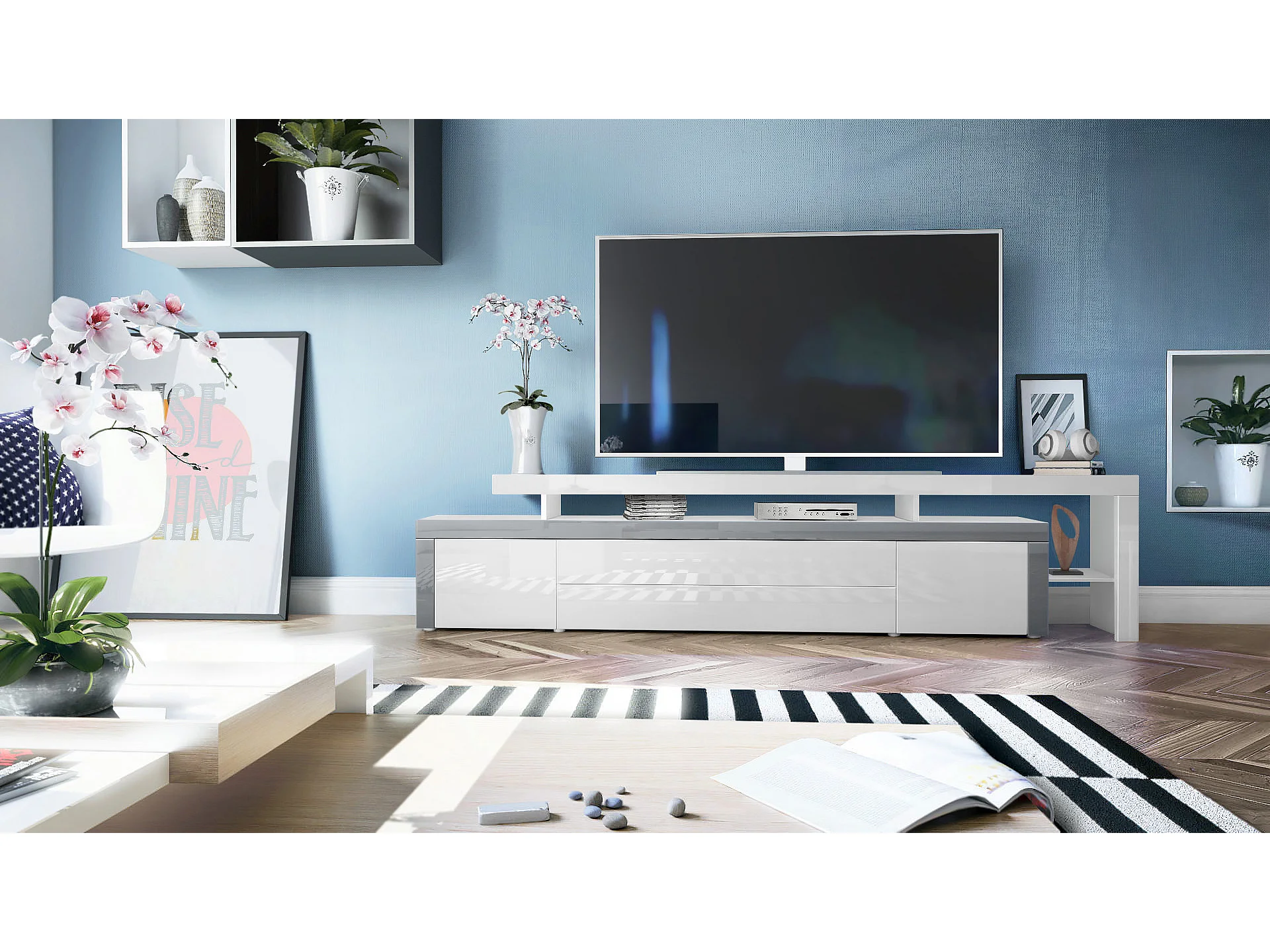 Mobile porta-tv Leon, Carcassa e supporto rialzato in bianco opaco / Frontale in bianco lucido con cornice in grigio lucido (227 x 52 x 35 cm)