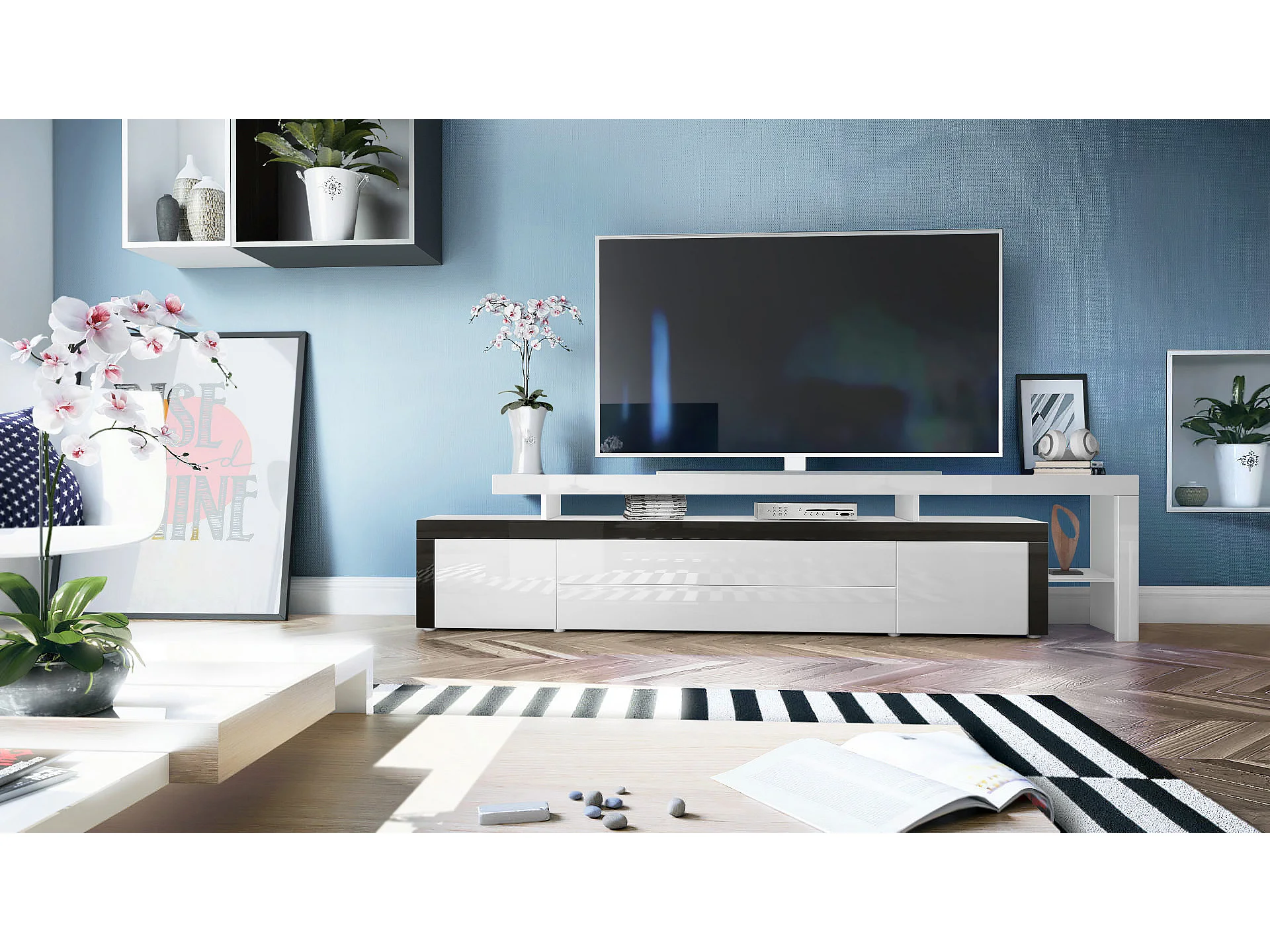 Mobile porta-tv Leon, Carcassa e supporto rialzato in bianco opaco / Frontale in bianco lucido con cornice in nero lucido (227 x 52 x 35 cm)