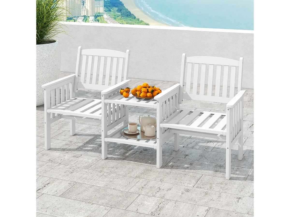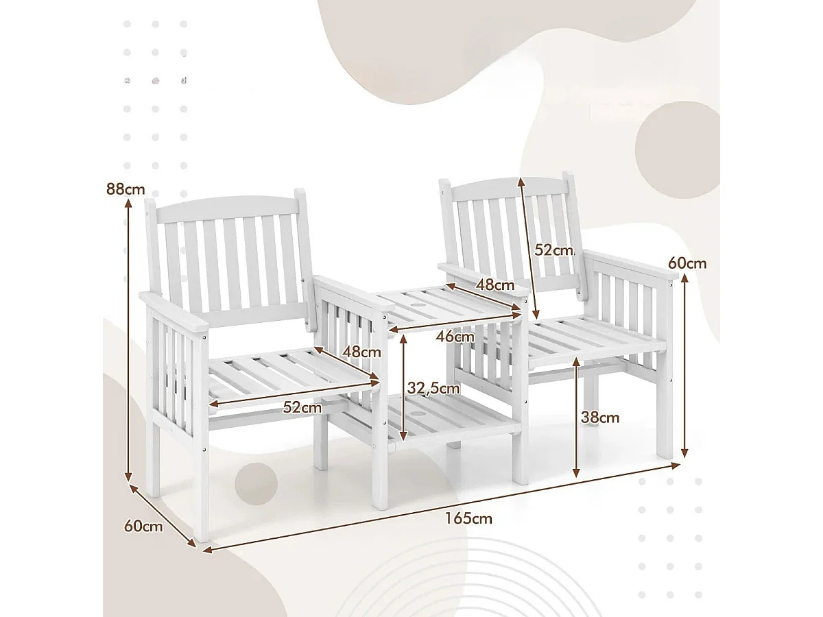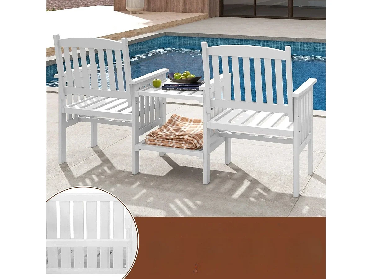 Panchina da giardino in legno di abete con tavolino a 2 ripiani e foro per ombrellone, Panchina per 2 persone Bianco