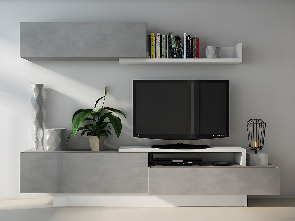 Parete TV con scomparti Cemento e bianco - MONTY