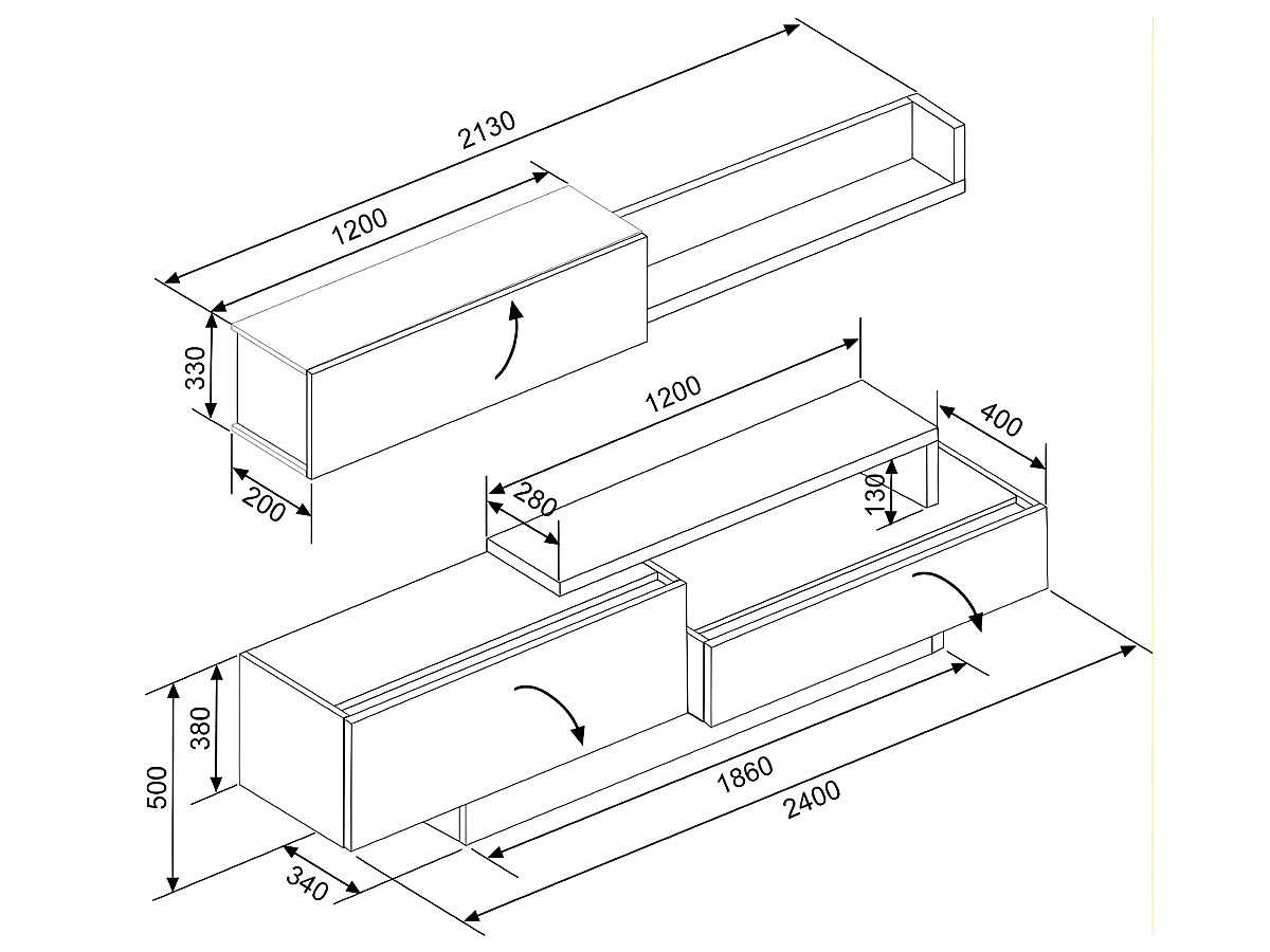 Da notare: le due parti del mobile sono indipendenti; la parte superiore può dunque essere posizionata all’altezza desiderata