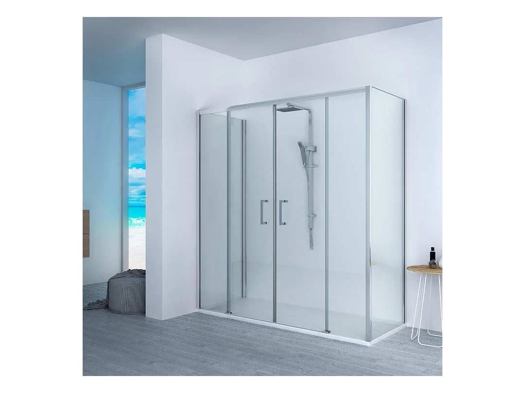 Piatto Doccia 70X195 cm Vulcano Line Extra Slim Bianco + Box doccia 70X195 cm Alto 200 cm Con Un Cristallo Fisso e Apertura centrale a 4 Cristalli