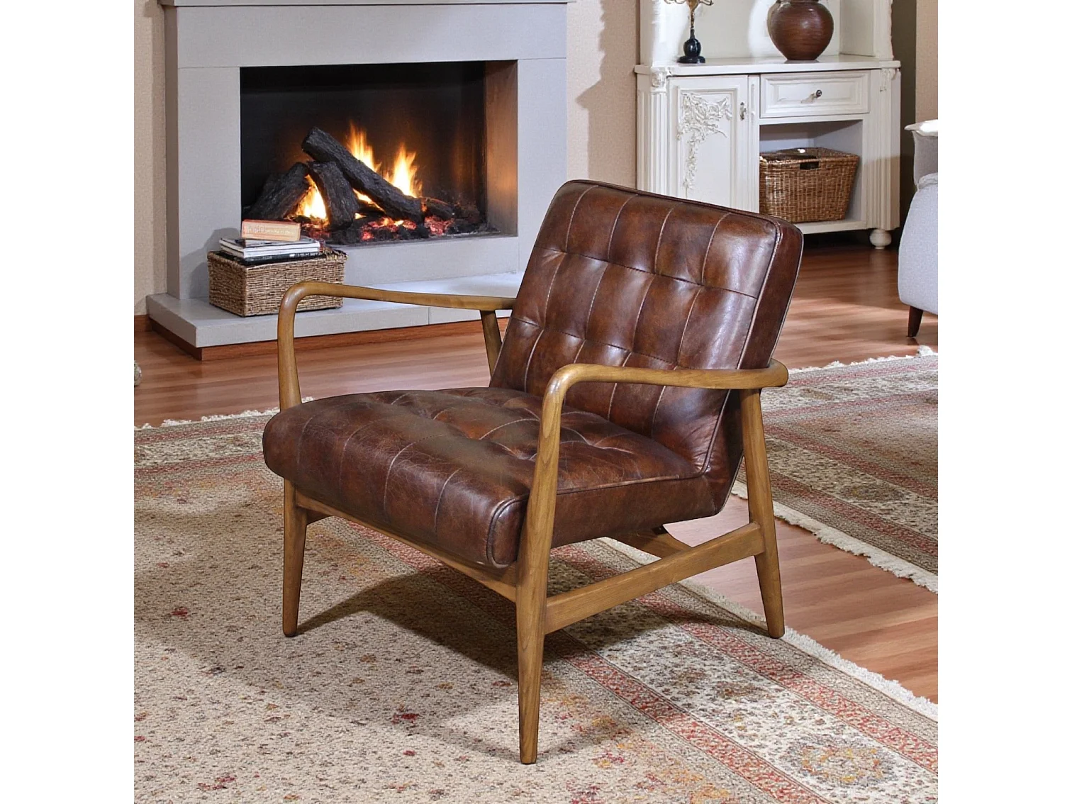 Poltrona club pelle marrone vintage e legno – modello Evan