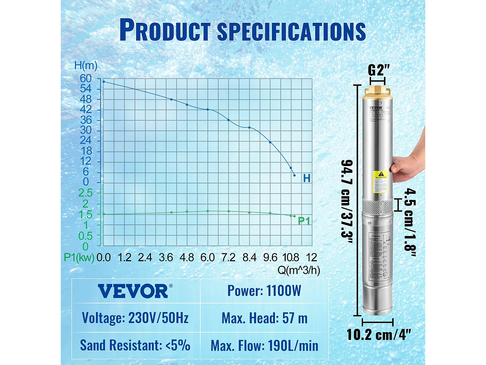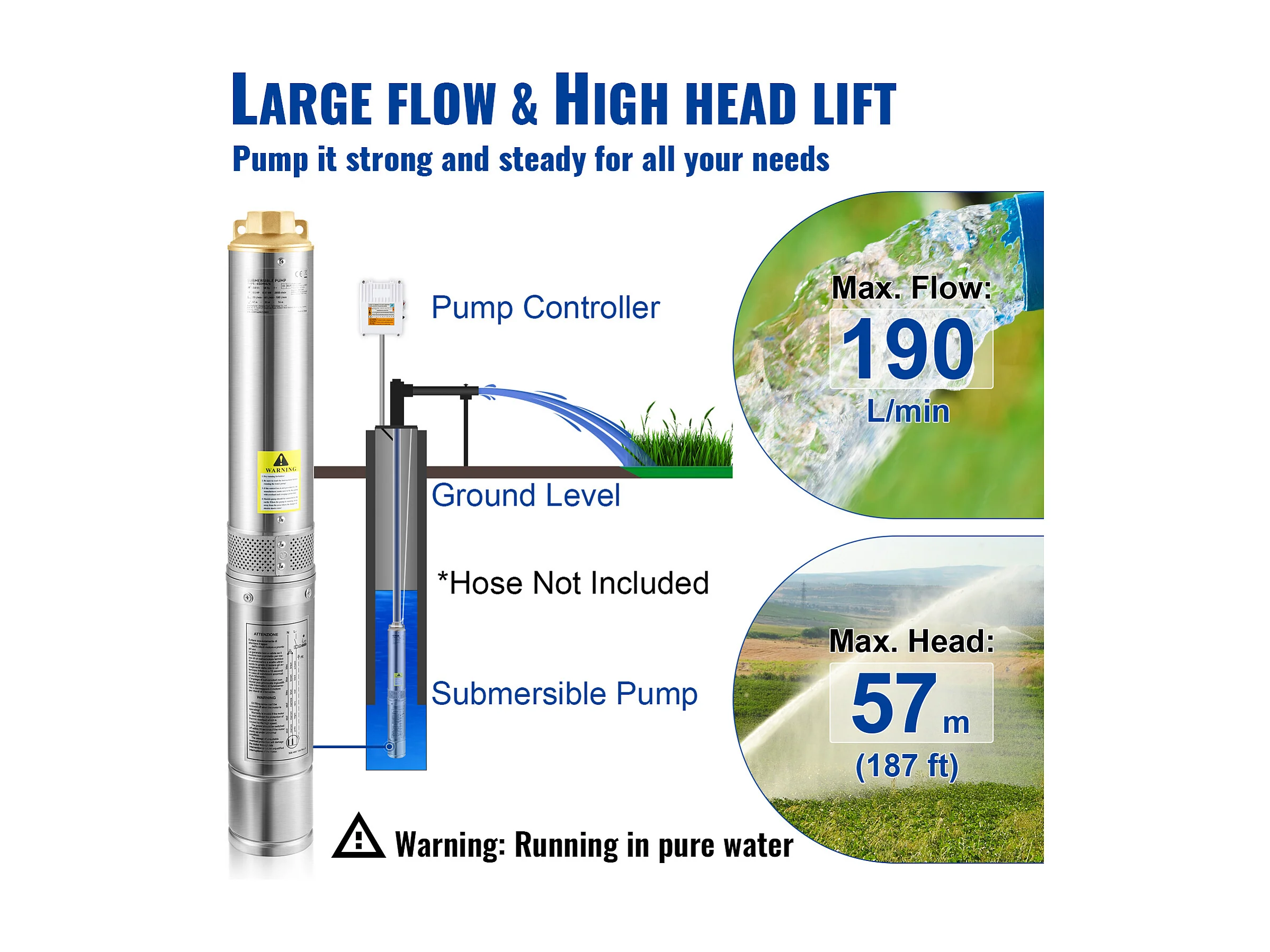Pompa Sommersa per Pozzi Profondi SucceBuy, 1100W, in Acciaio Inossidabile, 190L/min, 57 m