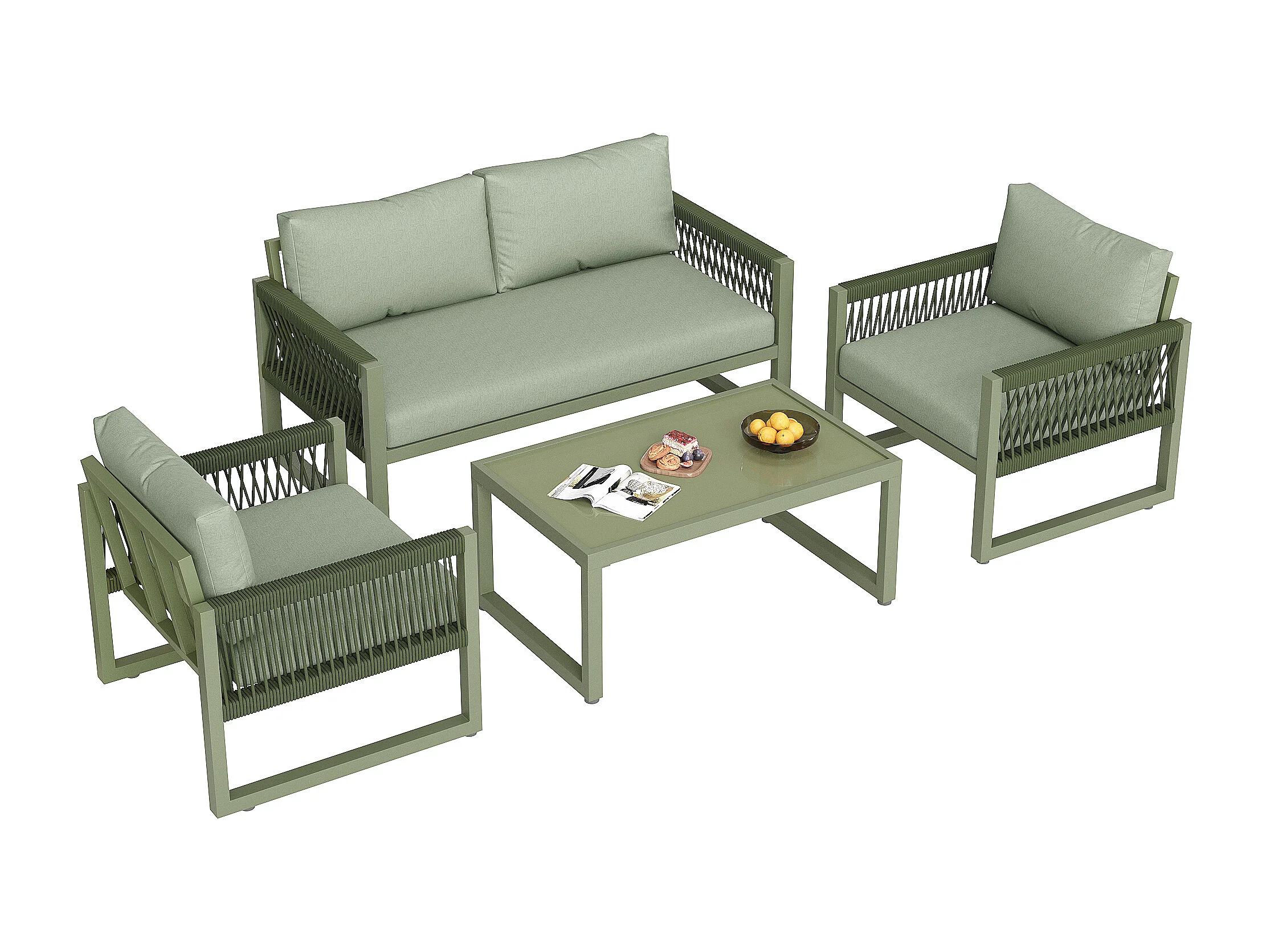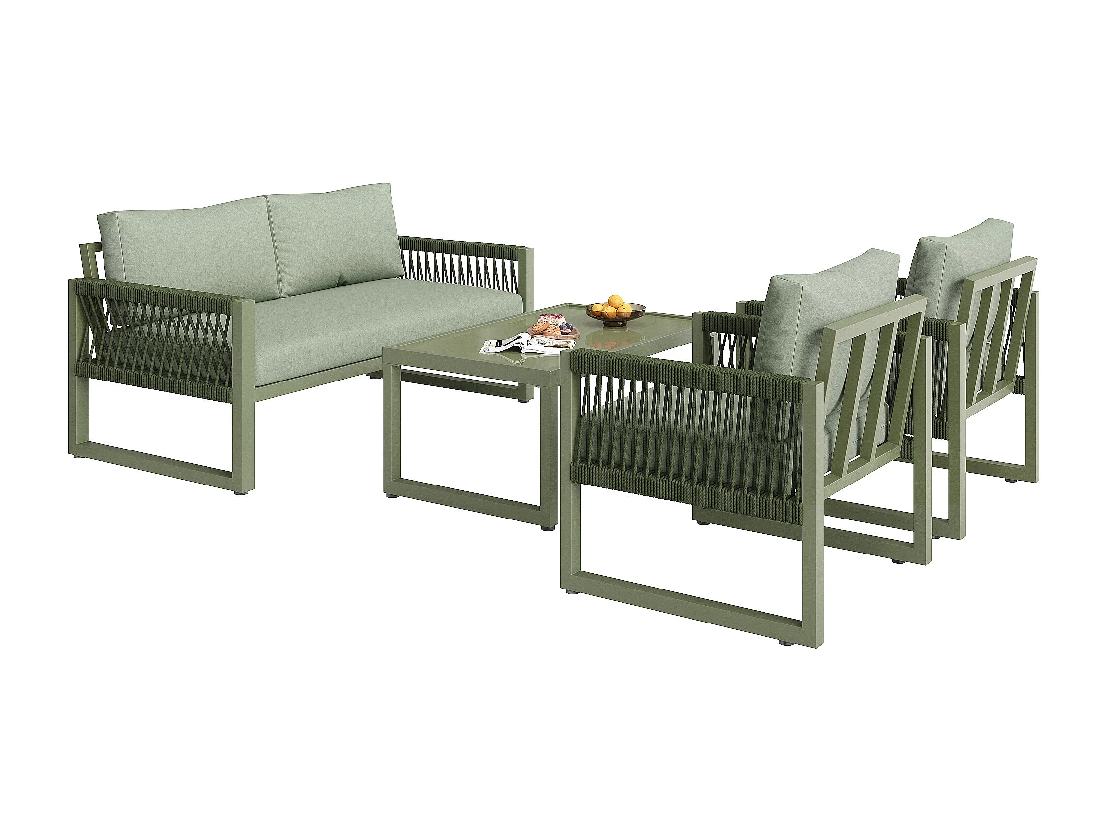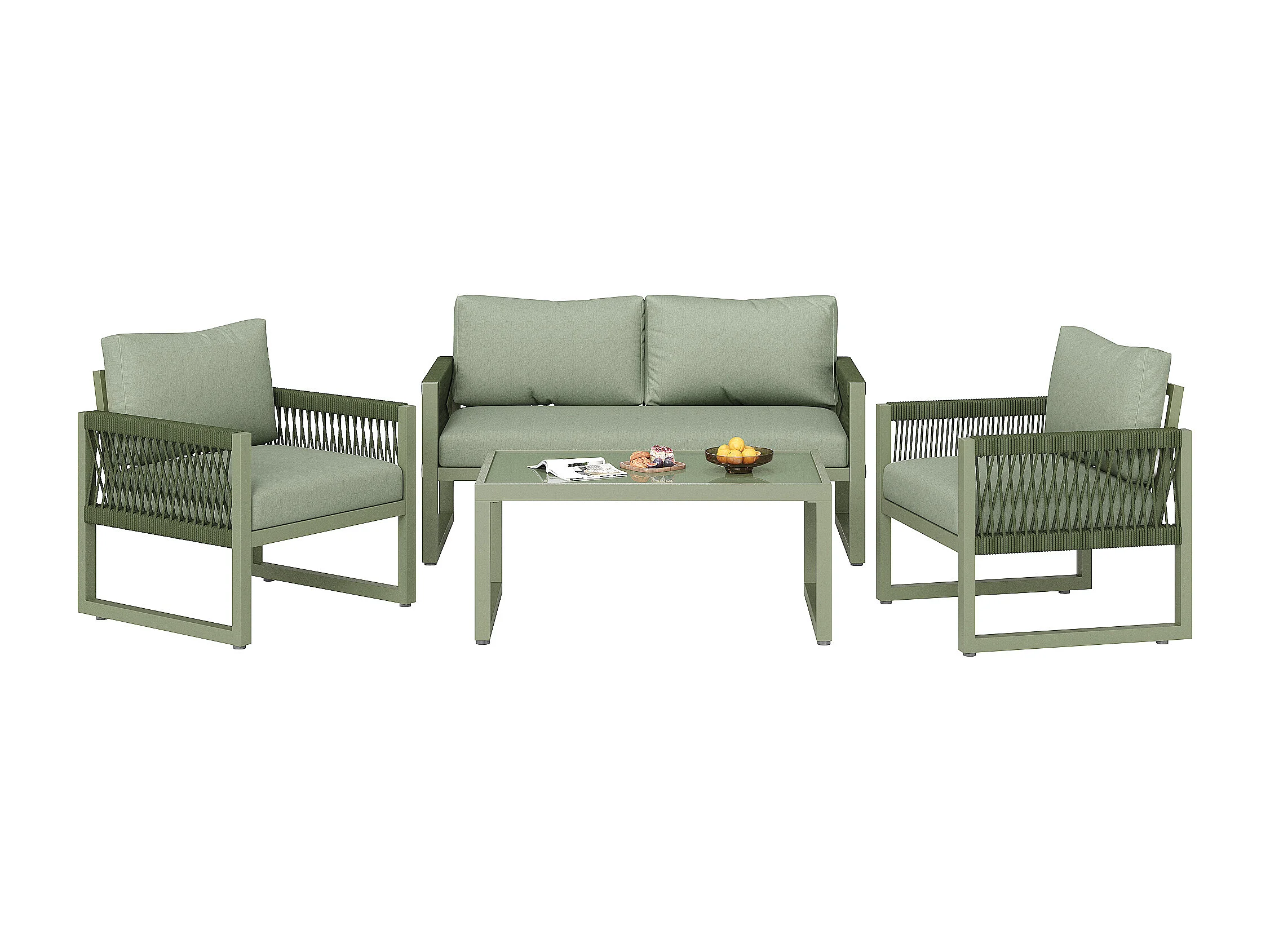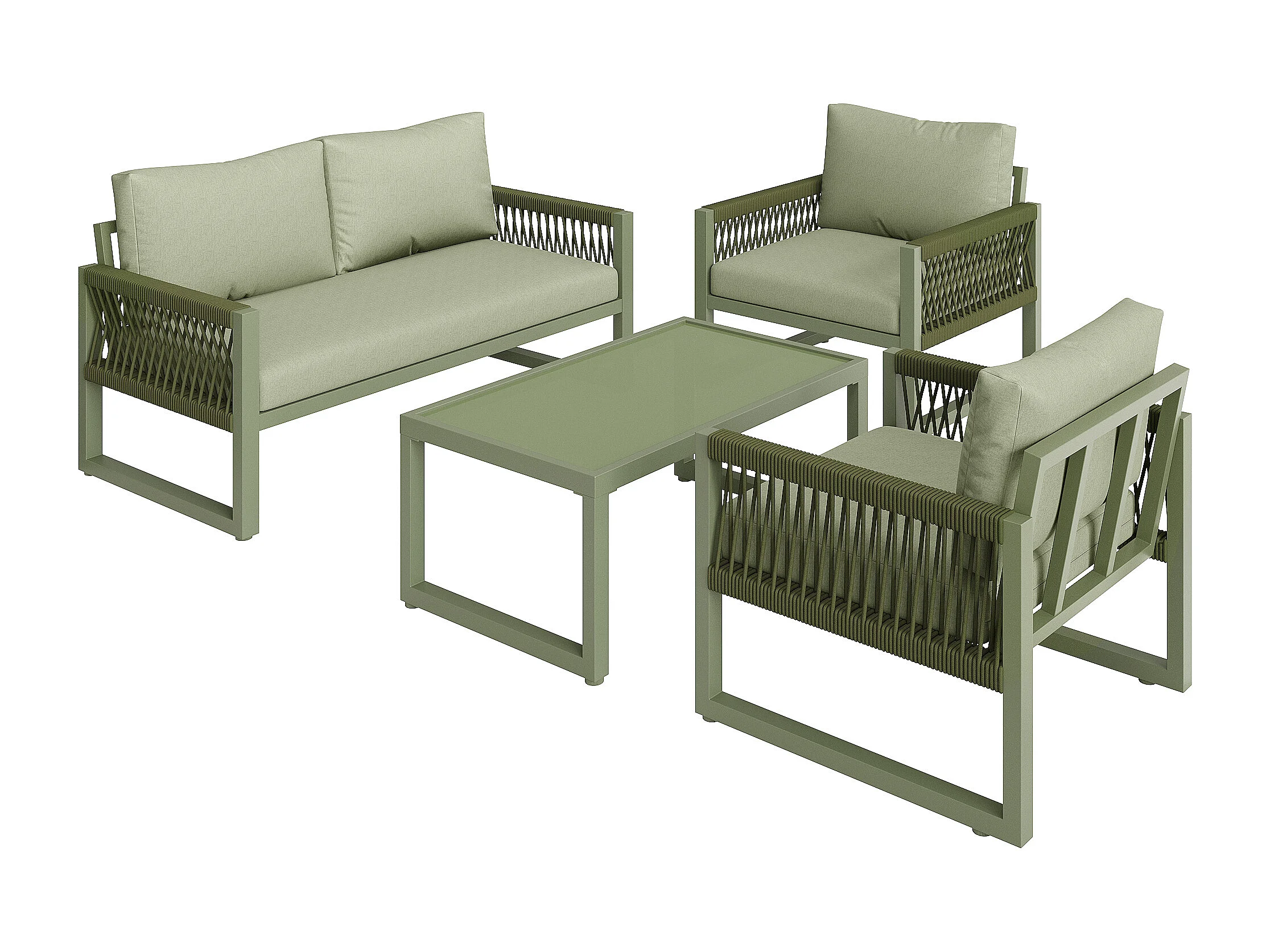 Salone da giardino in ferro zincato - 1 divano, 2 poltrone e 1 tavolino basso in vetro - decorato con corda - 4 posti - Verde Avocado