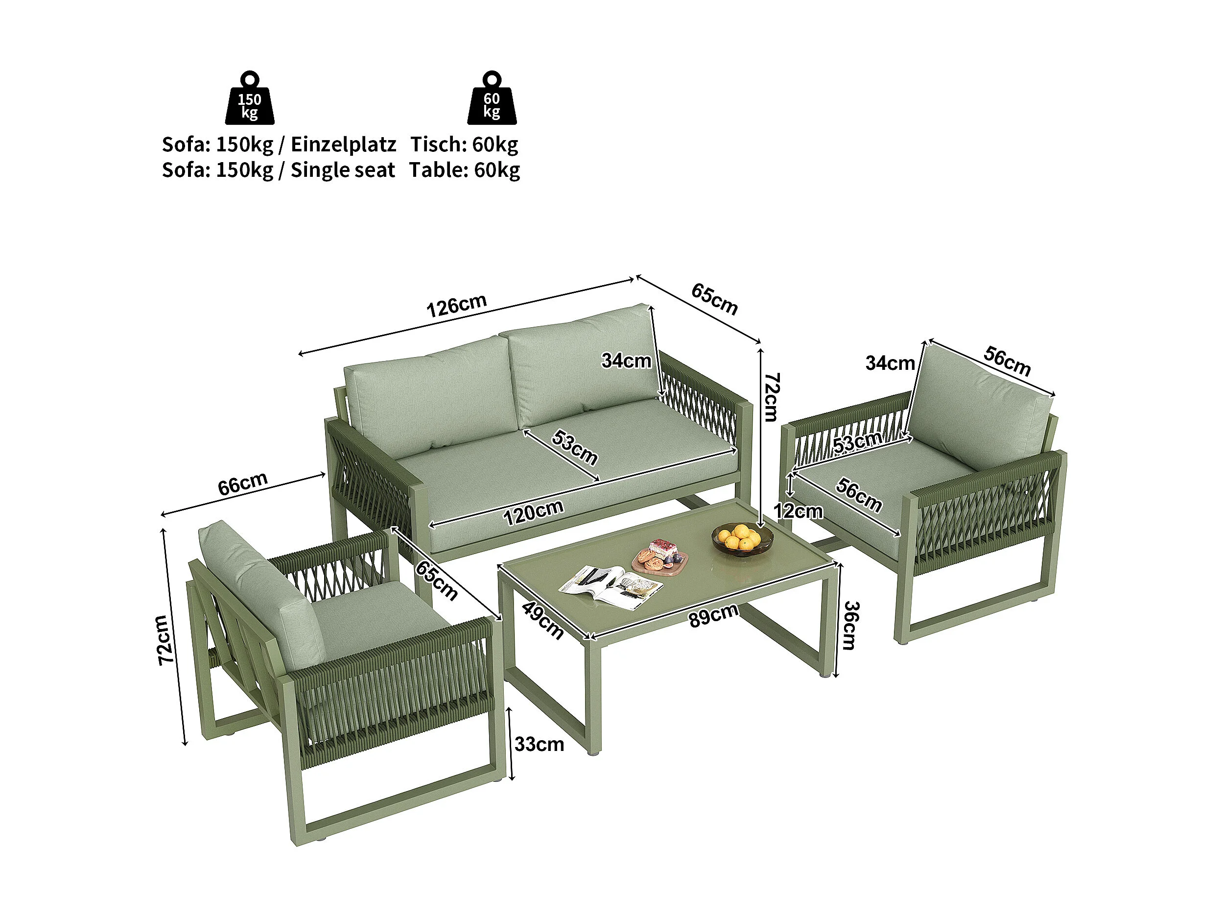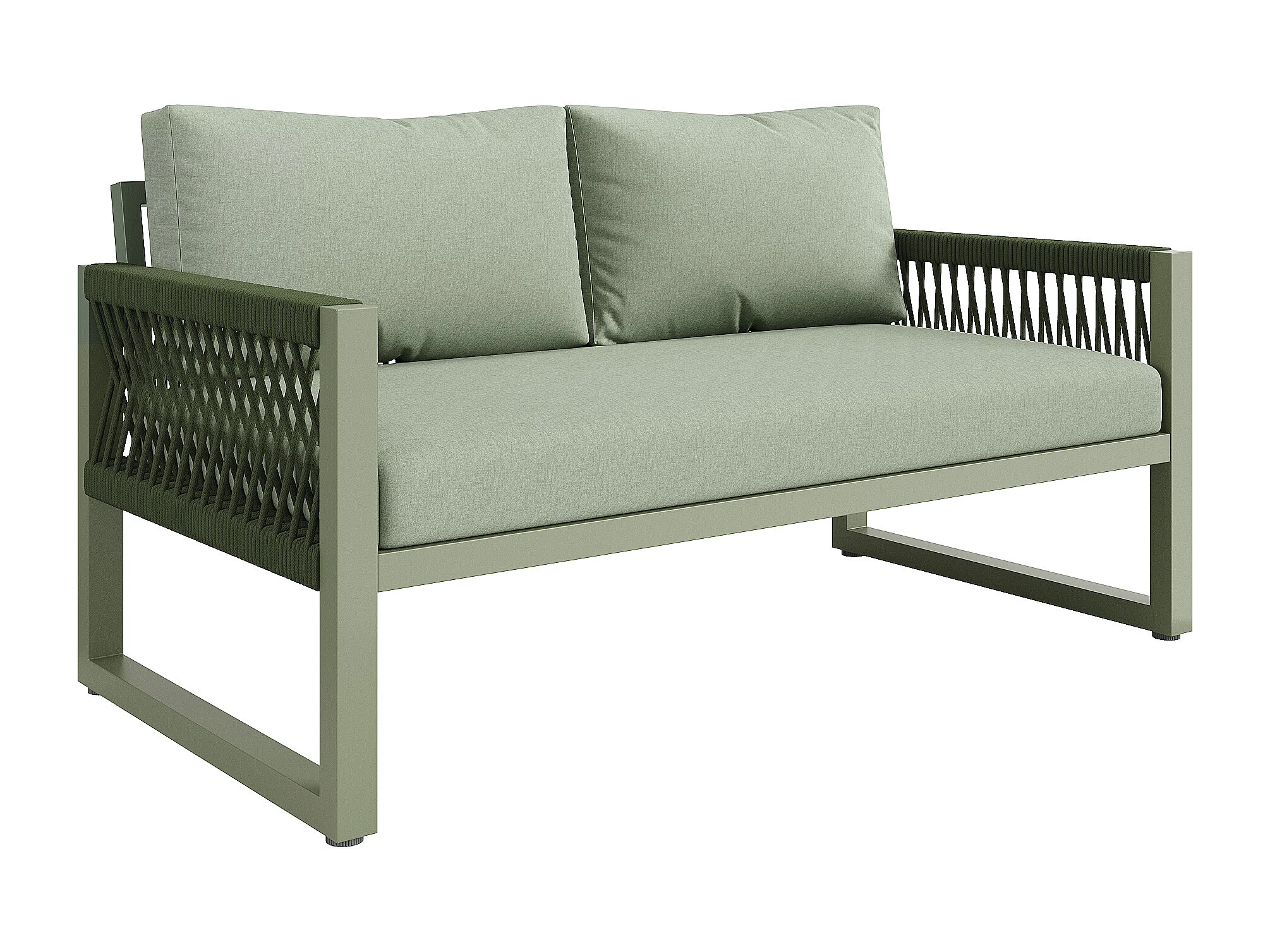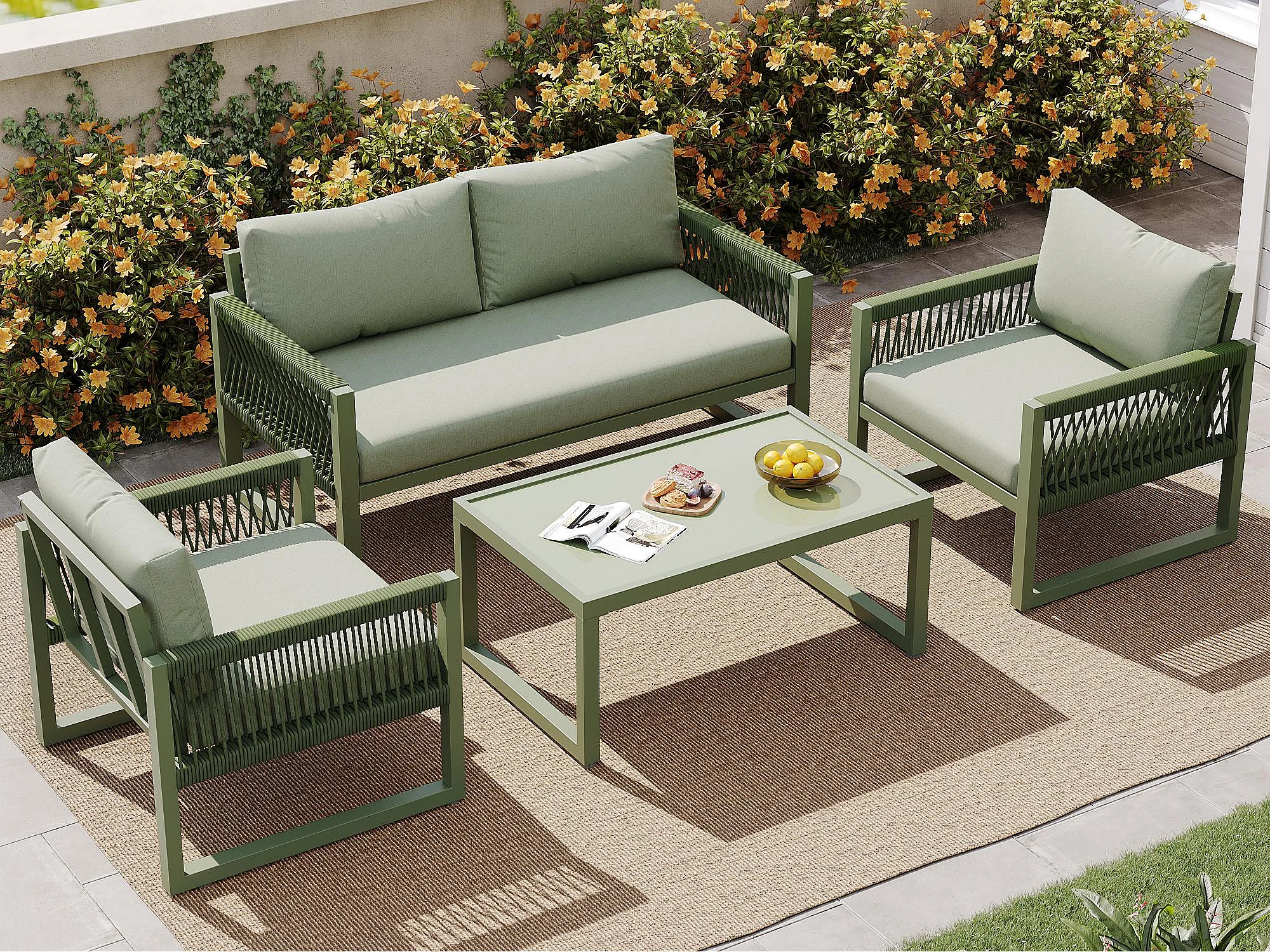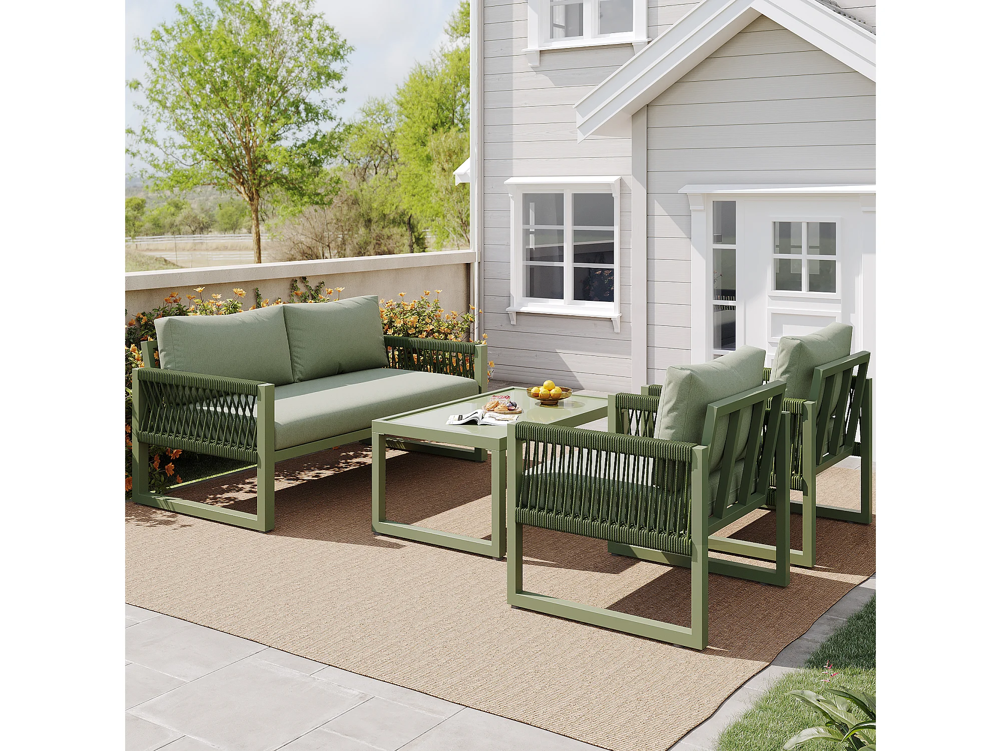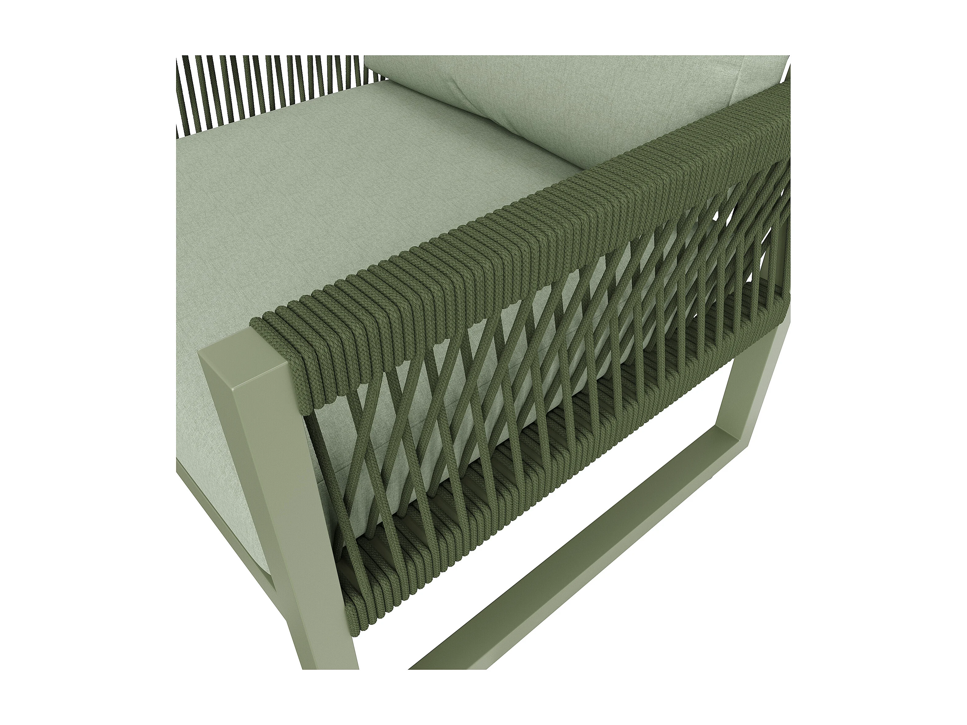 Salone da giardino in ferro zincato - 1 divano, 2 poltrone e 1 tavolino basso in vetro - decorato con corda - 4 posti - Verde Avocado