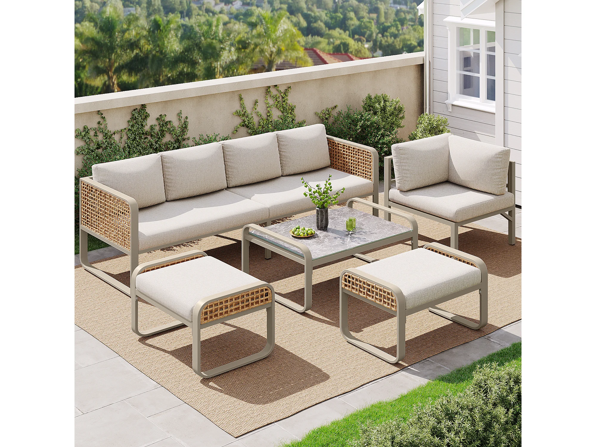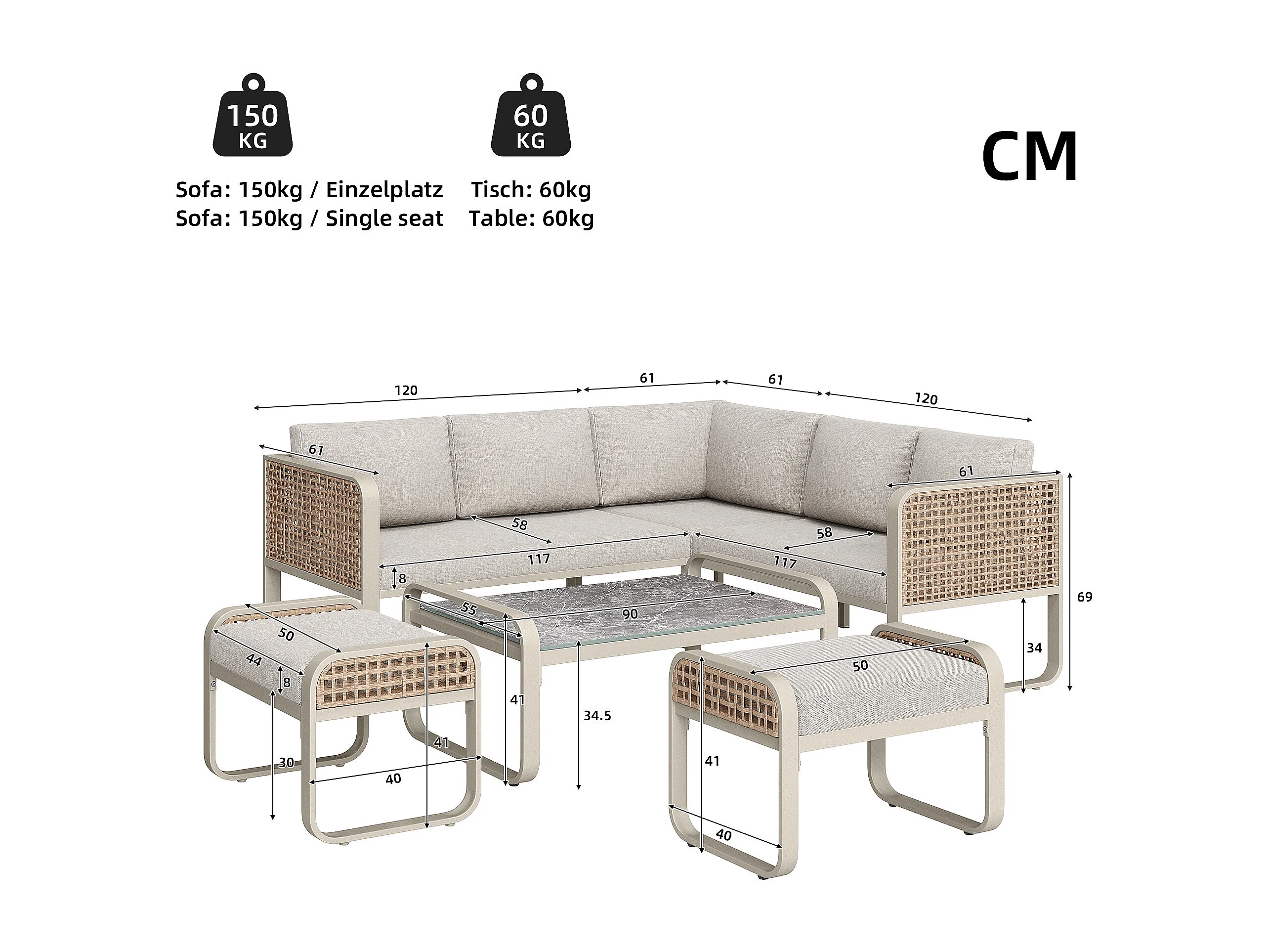 Set da giardino, mobili in rattan per 6-7 persone, divano angolare - in ferro zincato, piedi regolabili, Beige