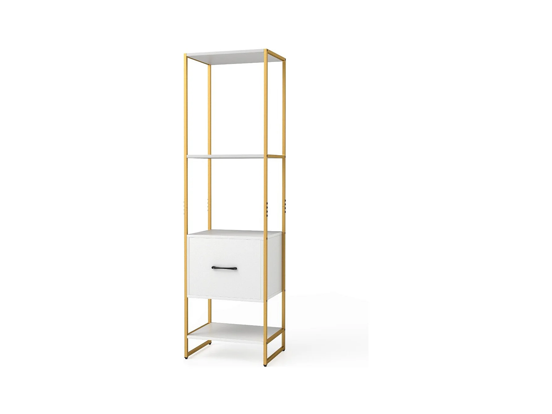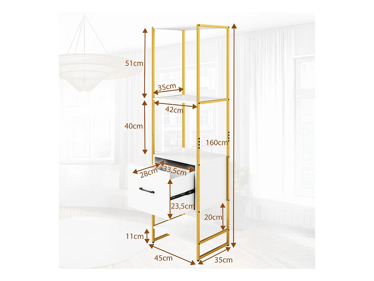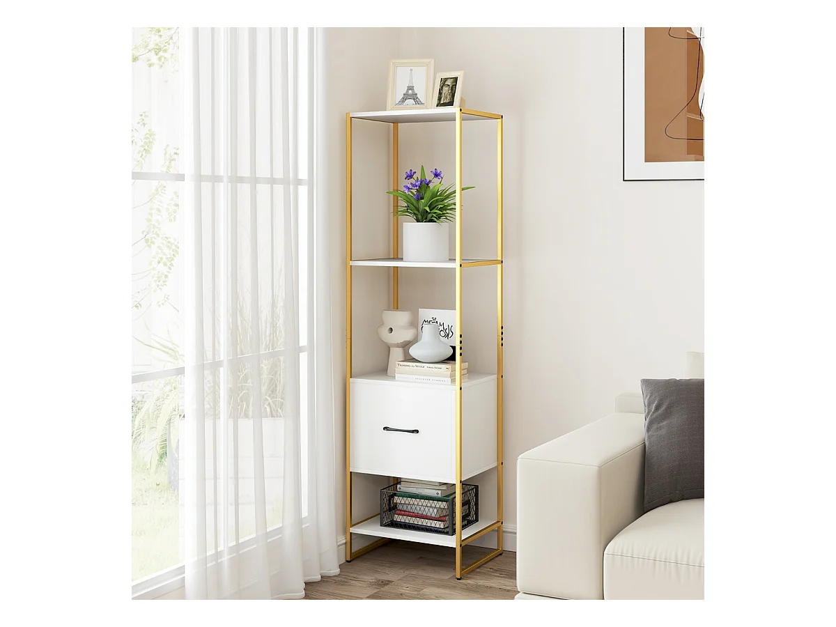 Scaffale a 5 ripiani con cassetto e struttura in metallo, Organizzatore di stoccaggio a ripiani per soggiorno Bianco