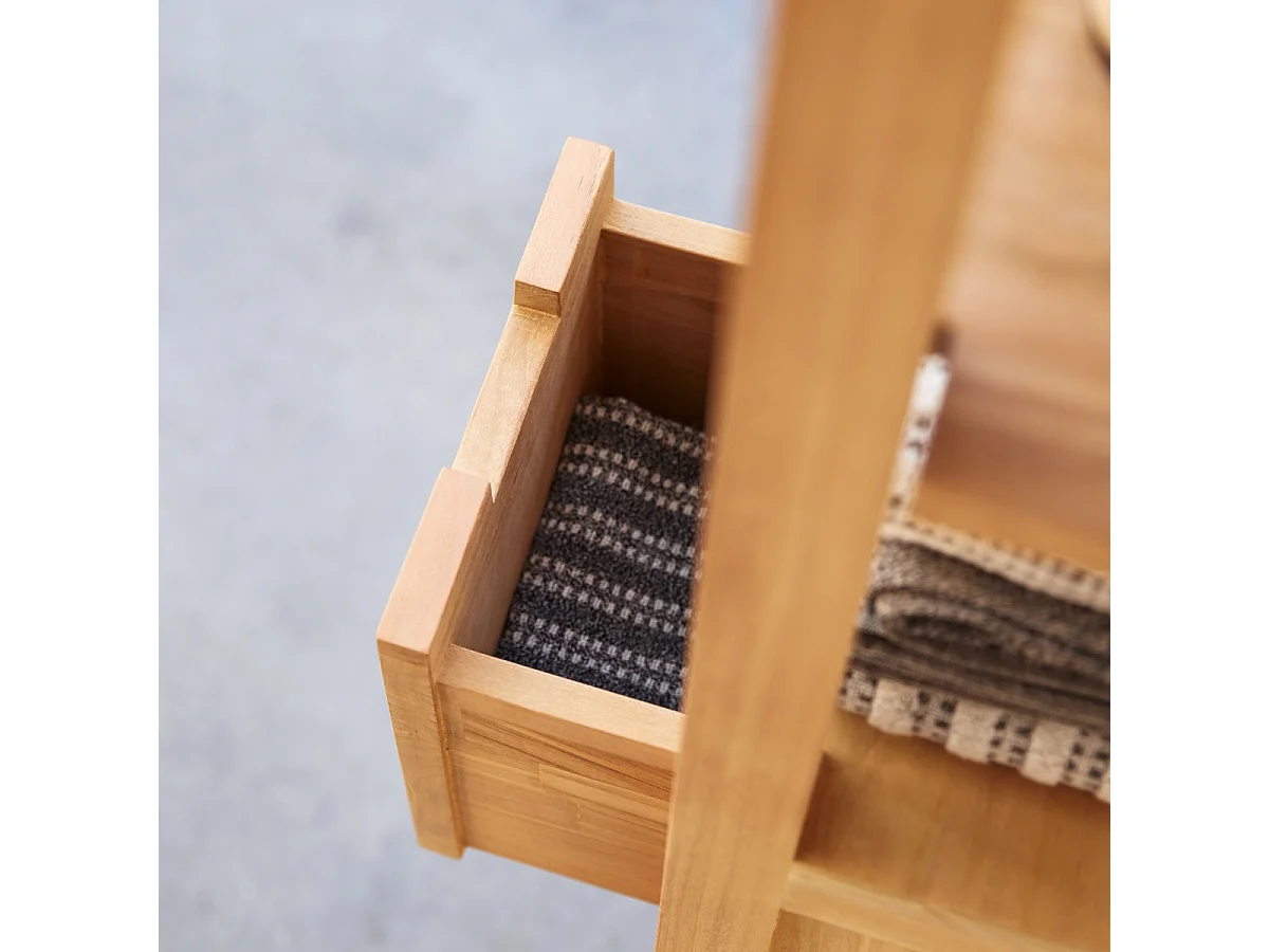 Scaffale a colonna in legno di Teak non trattato con 1 anta e 2 cassetti