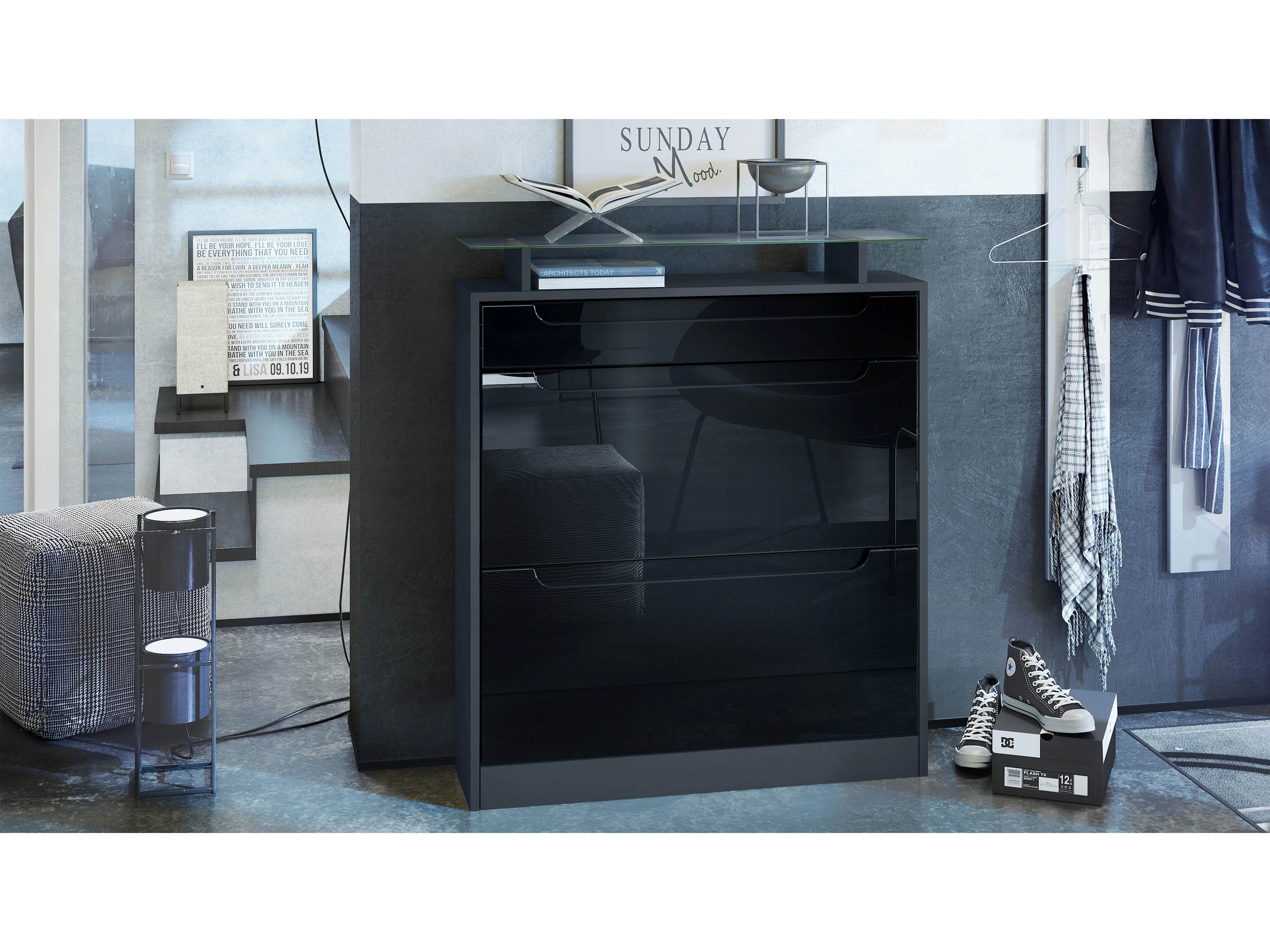Scarpiera Loret, mobile per 16 paia di scarpe con 2 ante a ribalta, 1 cassetto e ripiano in vetro, nero opaco/nero lucido (89 x 104 x 23 cm)