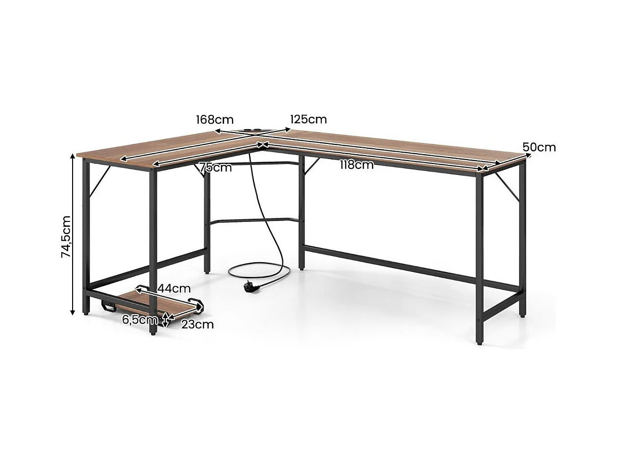 Scrivania ad angolo a L con presa di corrente, Scrivania per computer da 168cm con supporto CPU e telaio in metallo Naturale
