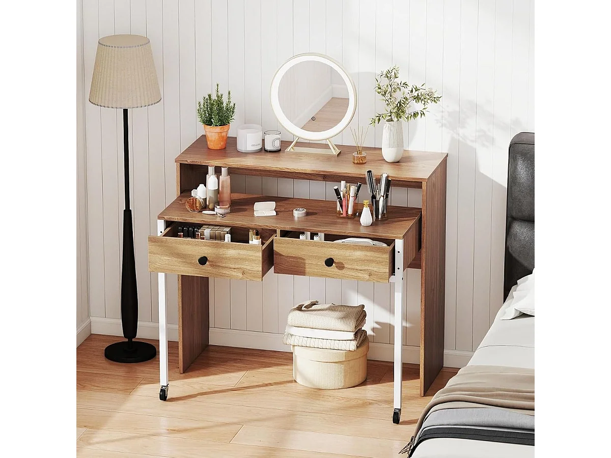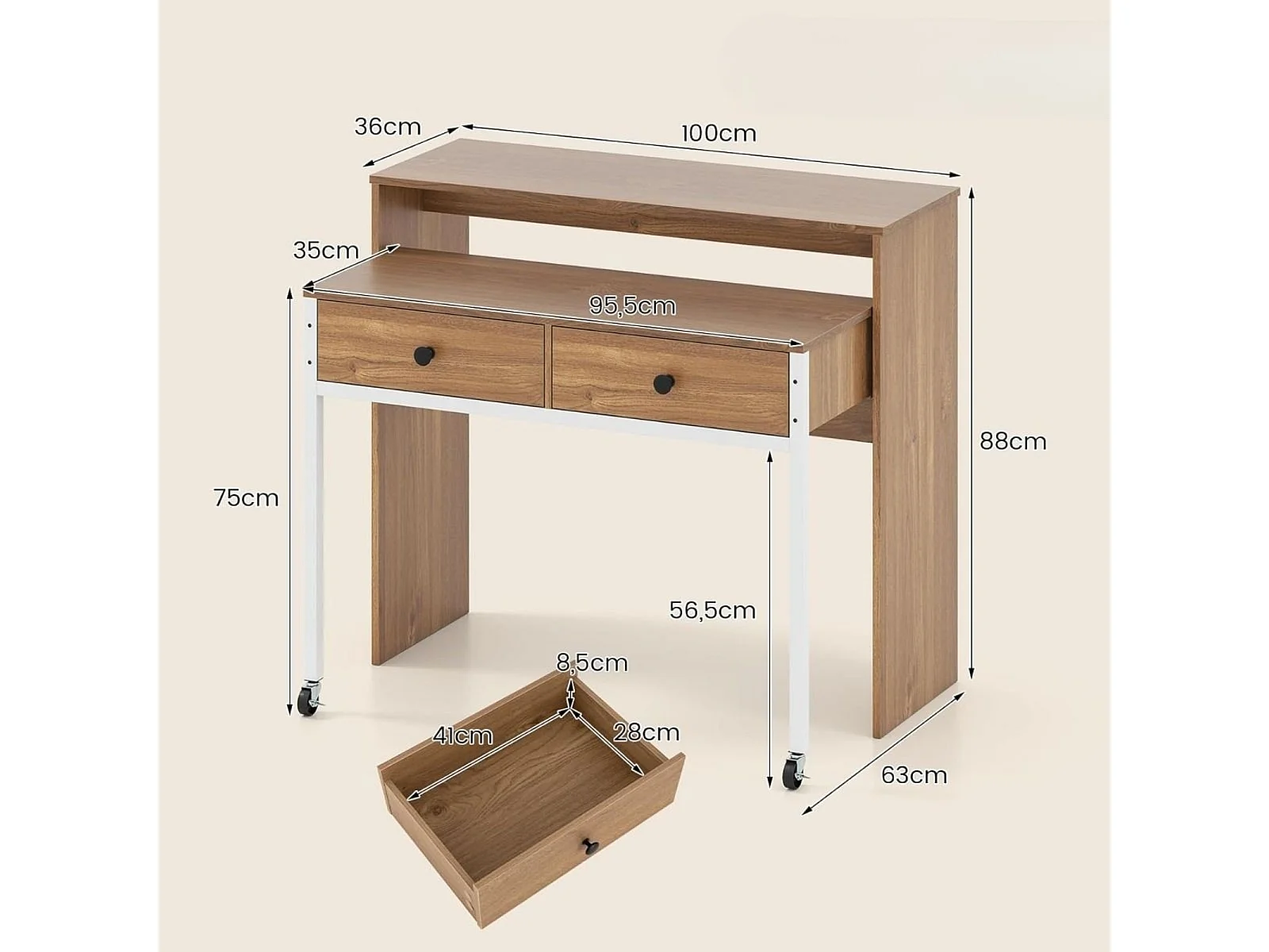 Scrivania allungabile piccola scrivania per computer con 2 cassetti e rotelle 100 x 63 x 88 cm naturale