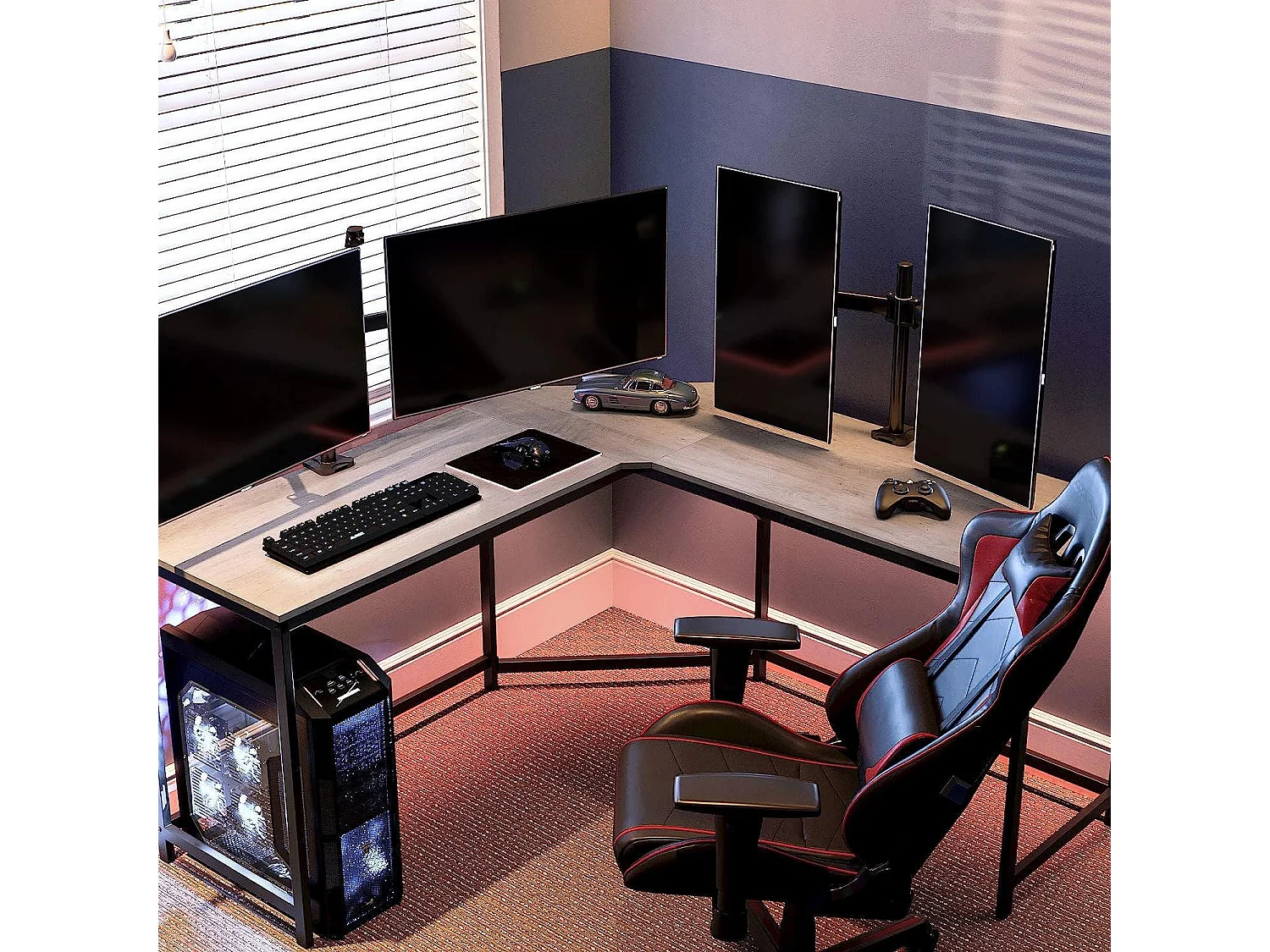 Scrivania ad angolo a L con presa di corrente, Scrivania per computer da 168cm con supporto CPU e telaio in metallo Nero