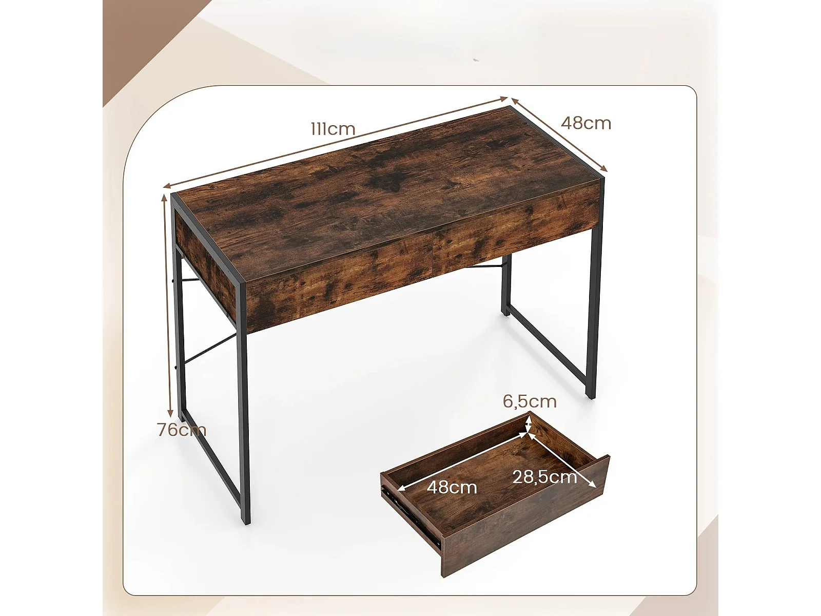 Scrivania per computer con 2 cassetti Scrivania compatta Tavolo da lavoro Tavolo da toilette Marrone rustico
