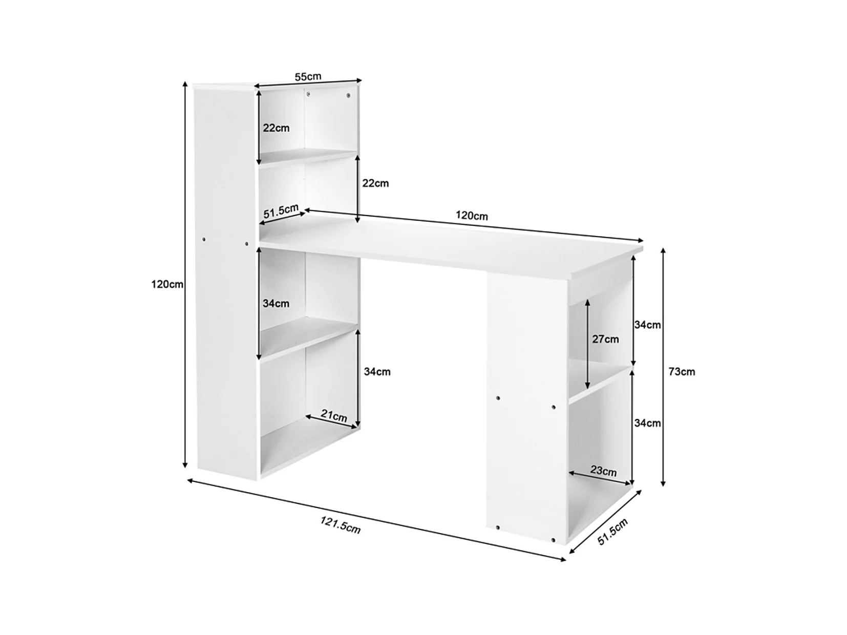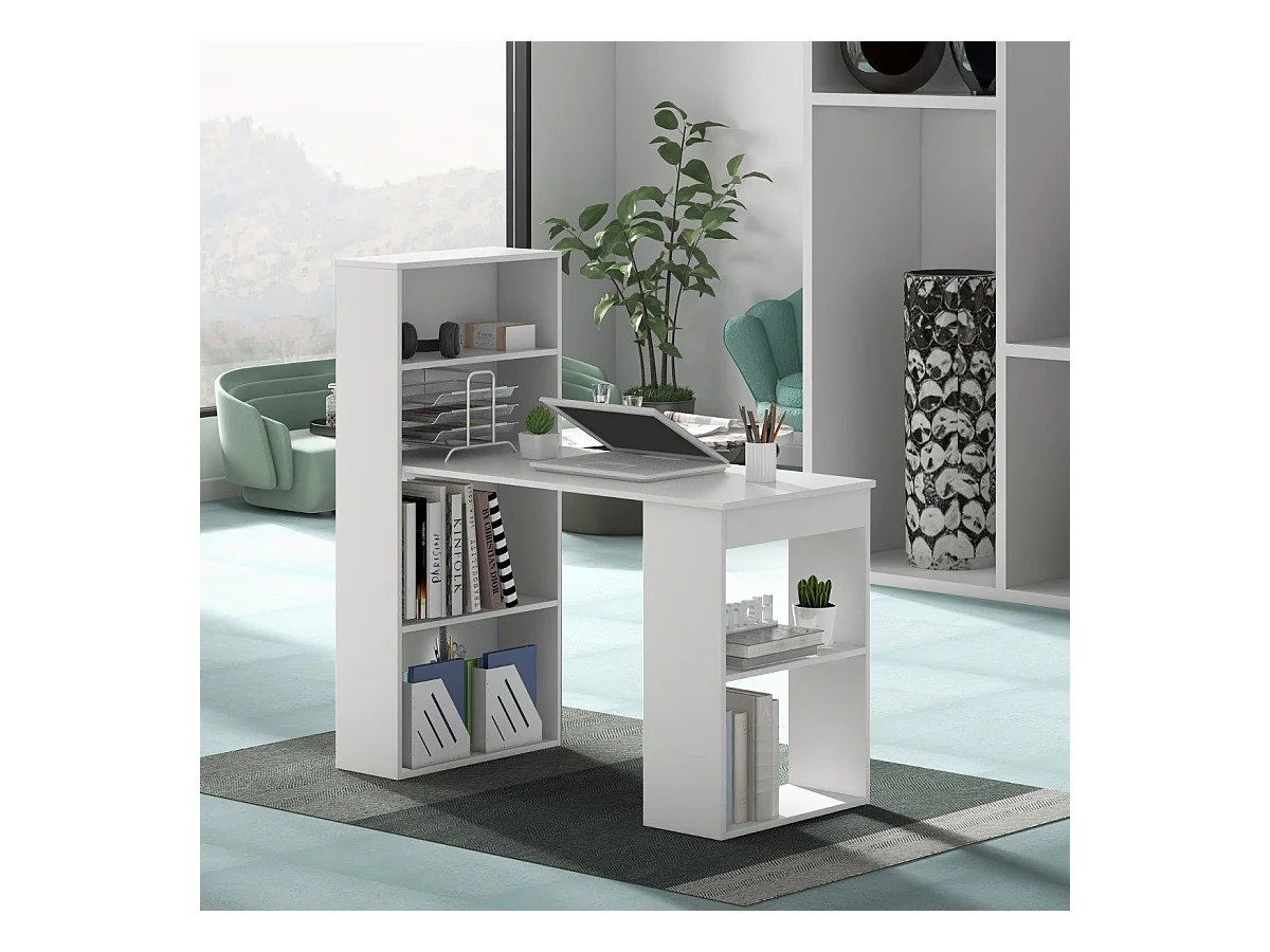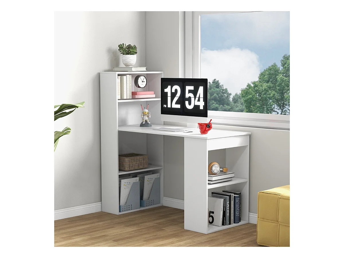 Scrivania per computer da 122cm con libreria, Postazione di studio moderna compatta con 6 ripiani Bianco