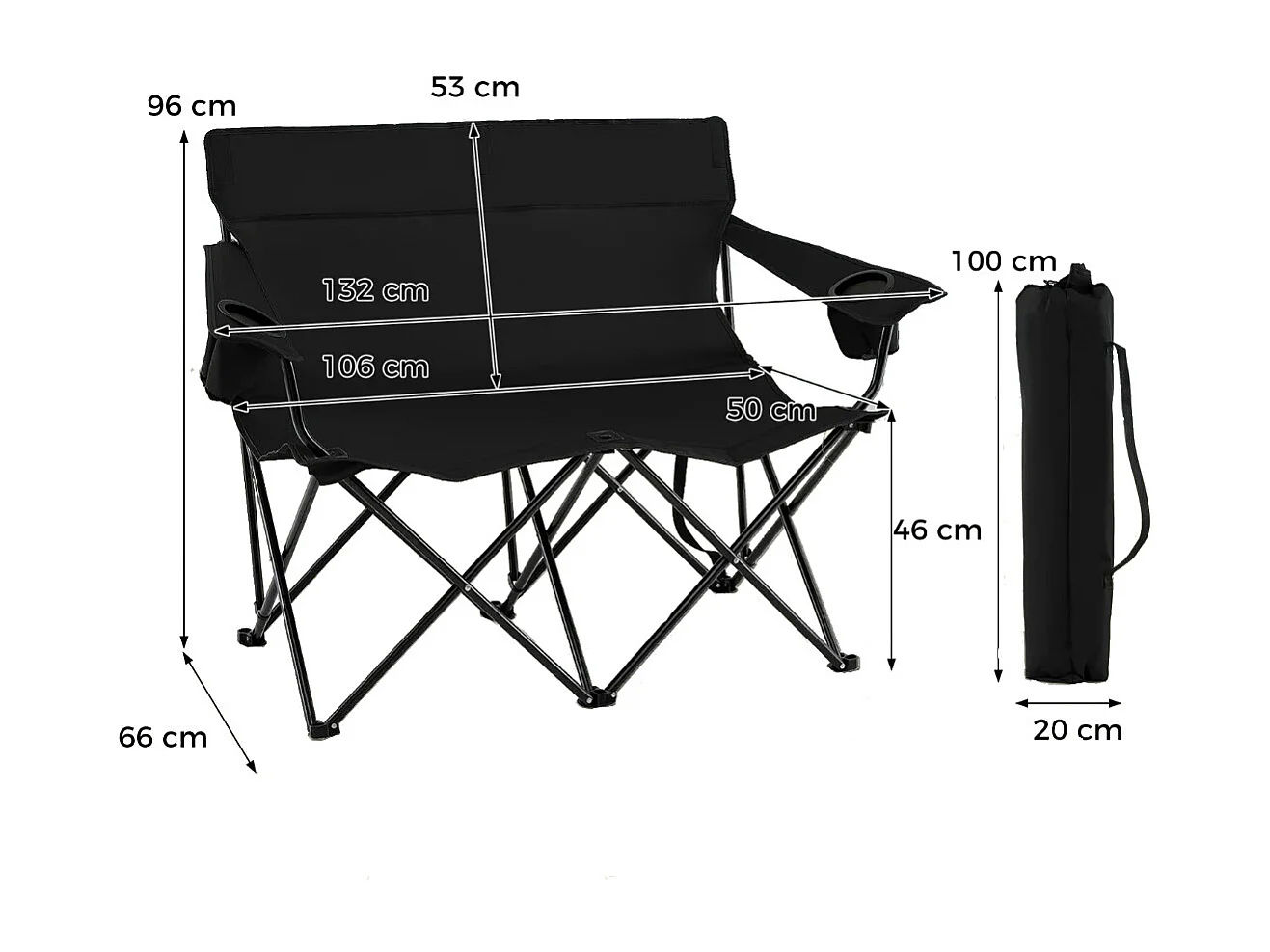 Sedia da campeggio doppia, Poltrona pieghevole per 2 persone con portabicchieri e braccioli e borsa per il trasporto Nero