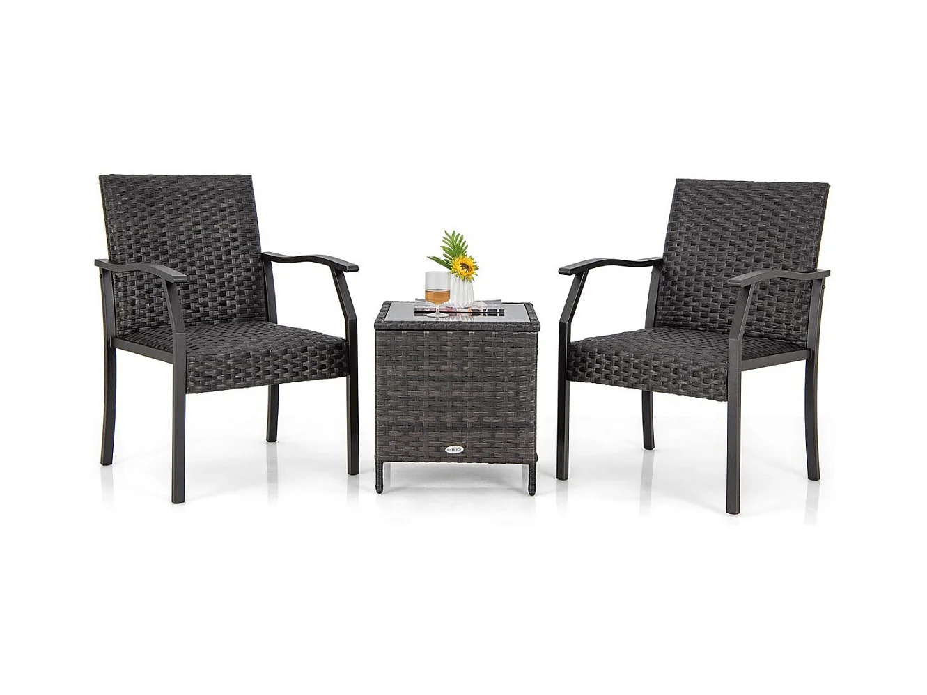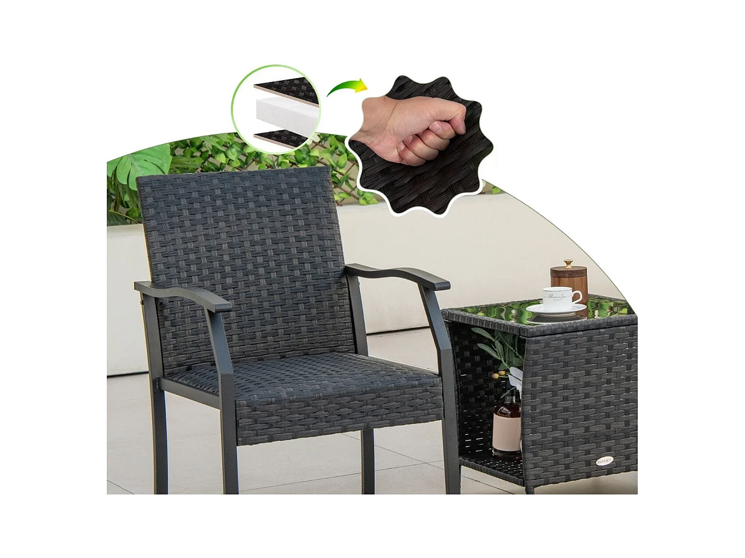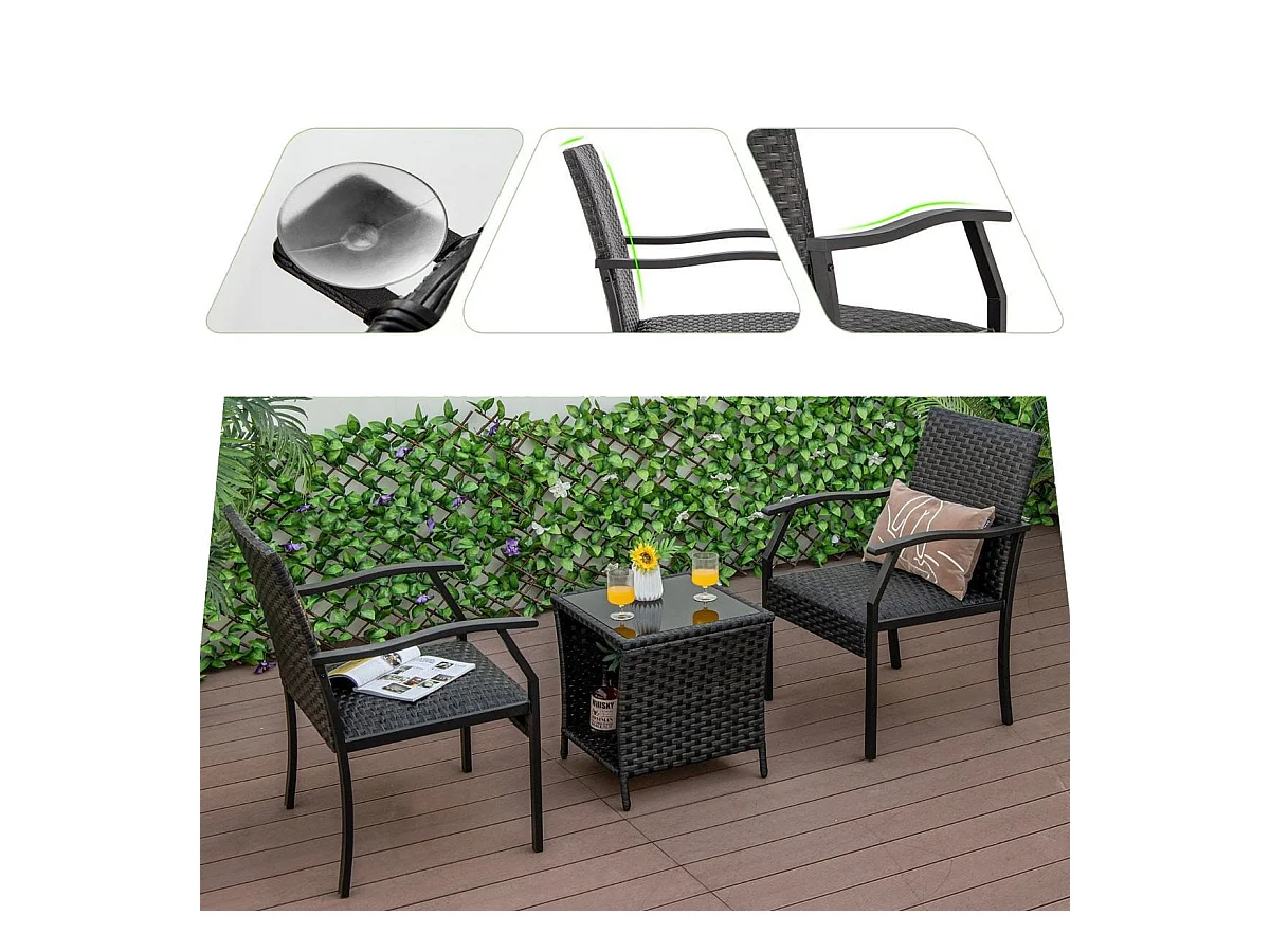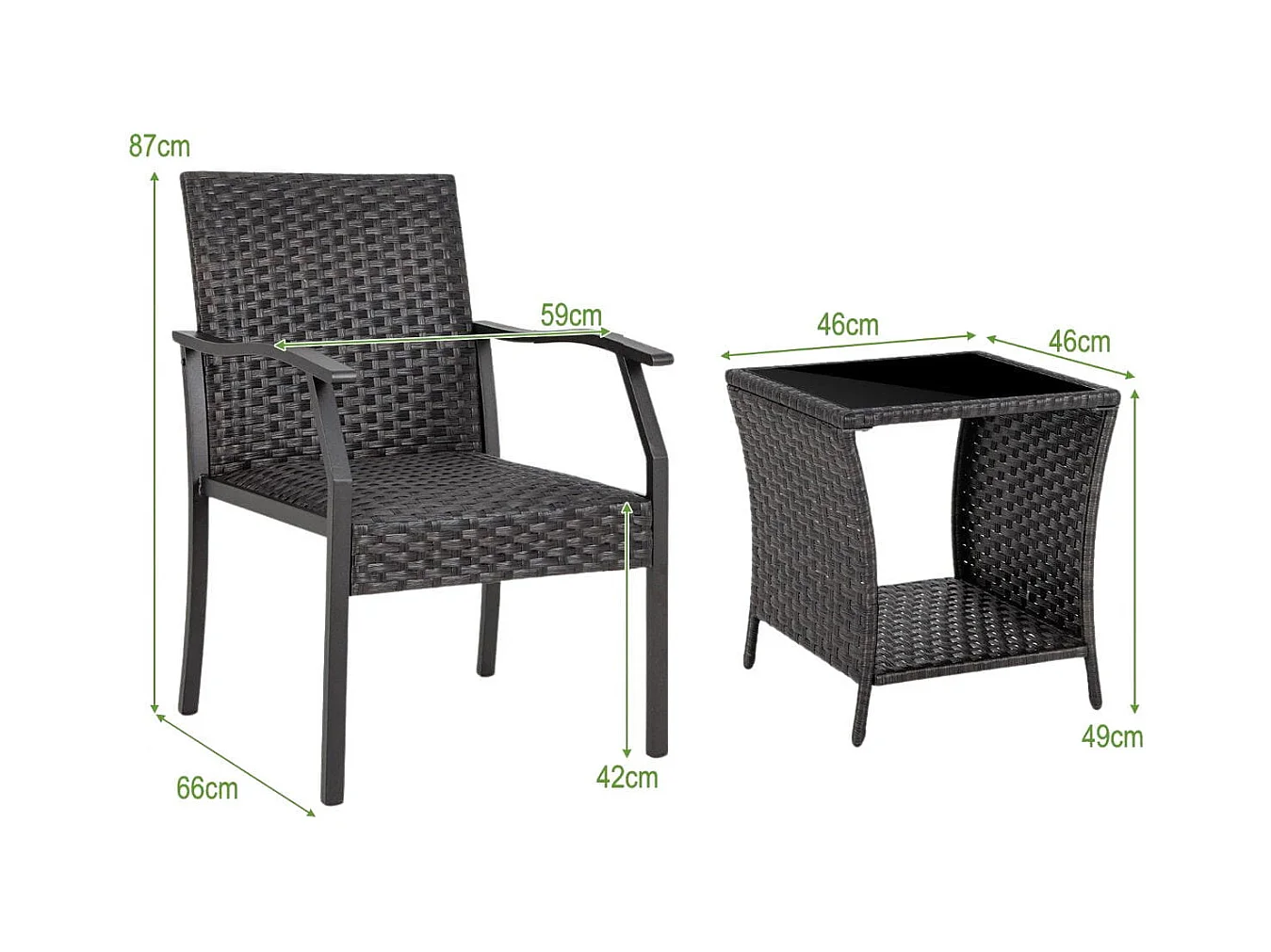 Set 3 mobili in vimini da giardino con cuscini, Set sedie e tavolino da esterno con piano tavolo in vetro temperato