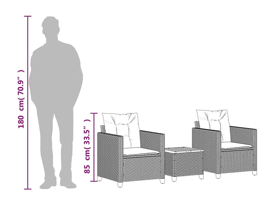 Set da Pranzo da Giardino 3 pz con Cuscini Nero in Polyrattan