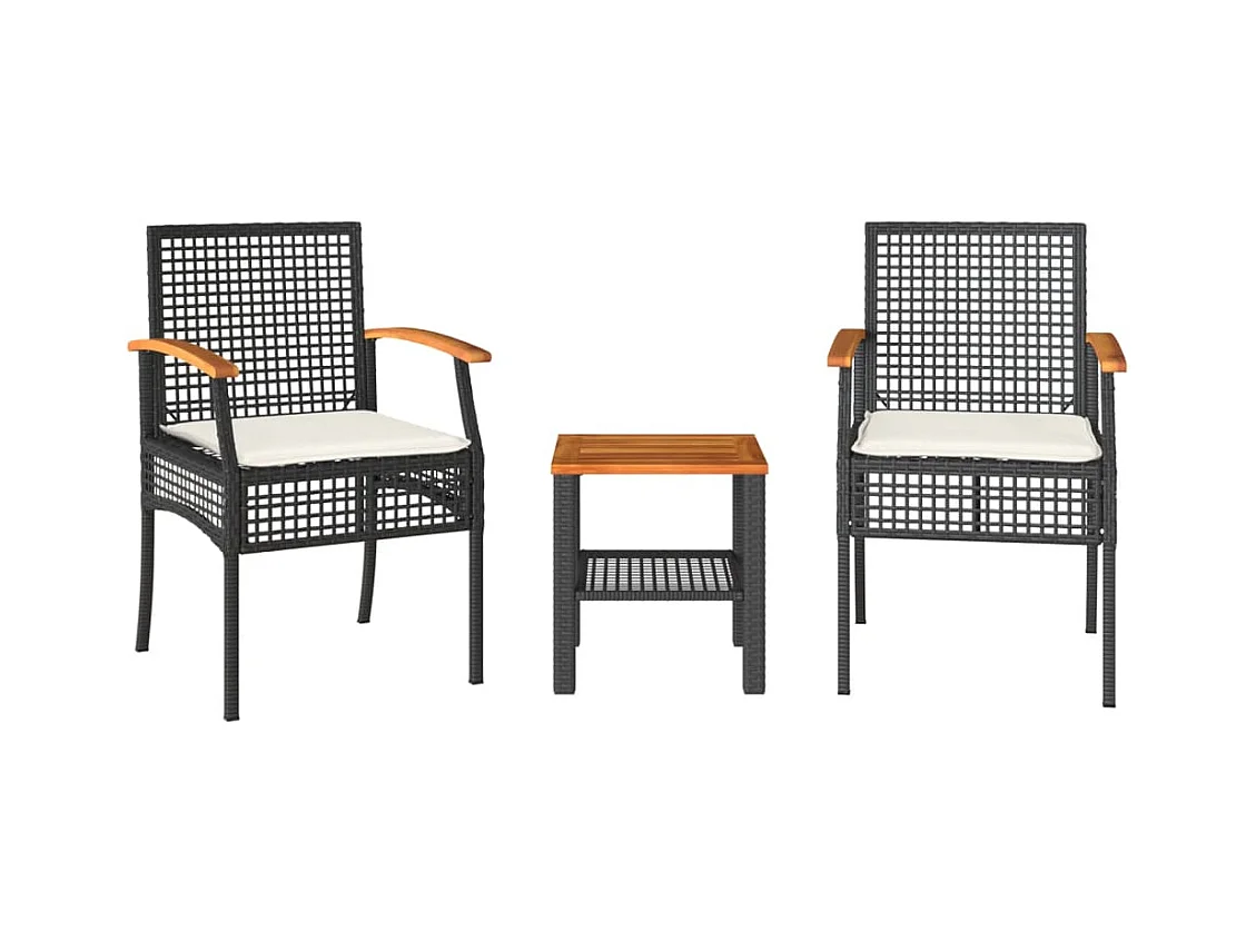 Set da Bistrò 3 pz con Cuscini Nero Polyrattan e Legno Acacia