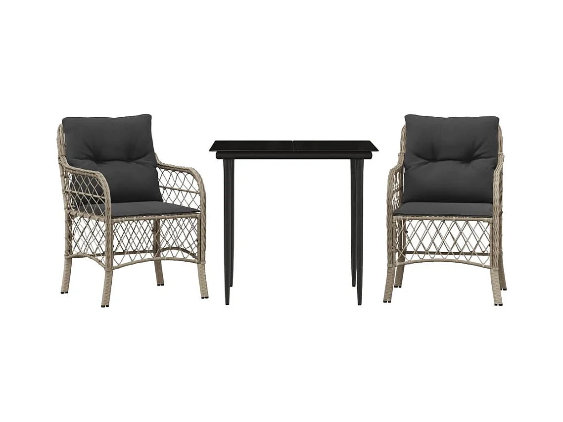 Set da bistrot 3 pezzi e cuscini in vimini di resina grigio chiaro