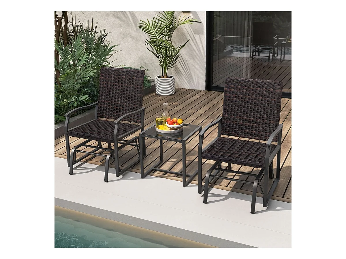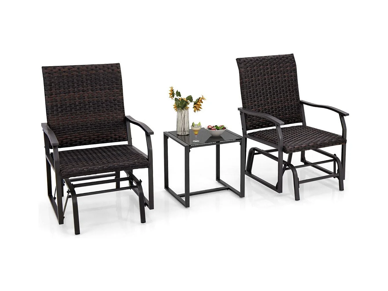 Set da giardino a dondolo 3 pezzi, Set di mobili in vimini con tavolino in vetro temperato seduta in rattan Marrone