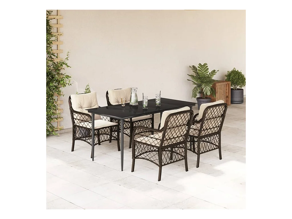 Set da Pranzo da Giardino 5pz con Cuscini in Polyrattan Marrone