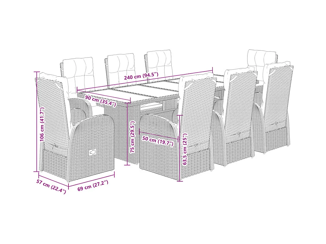 Set da Pranzo da Giardino 9 pz con Cuscini Nero in Polyrattan
