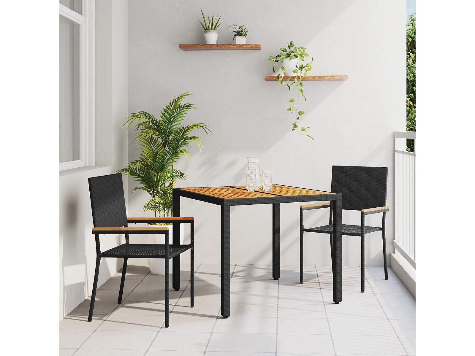 Set da pranzo da giardino 3 pezzi in polyrattan nero e acacia