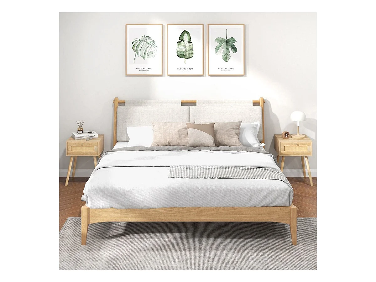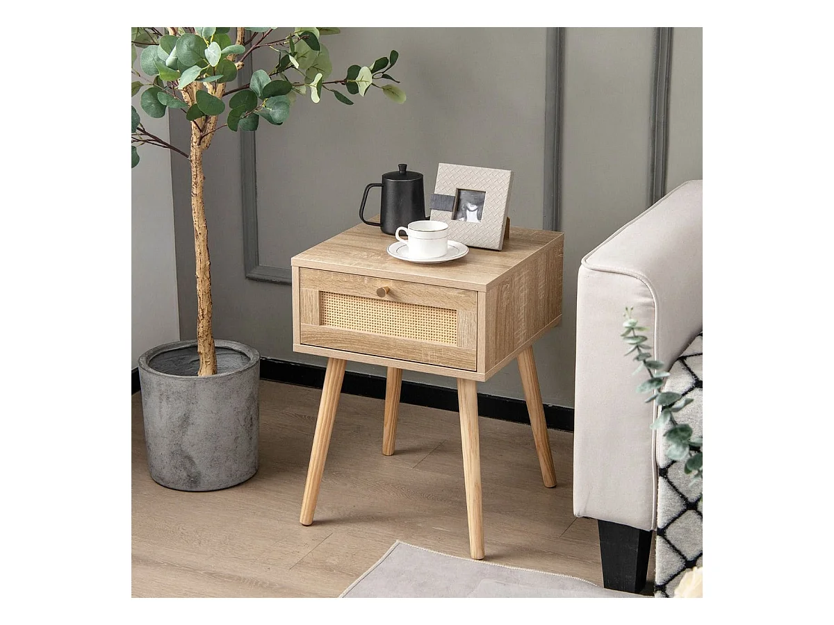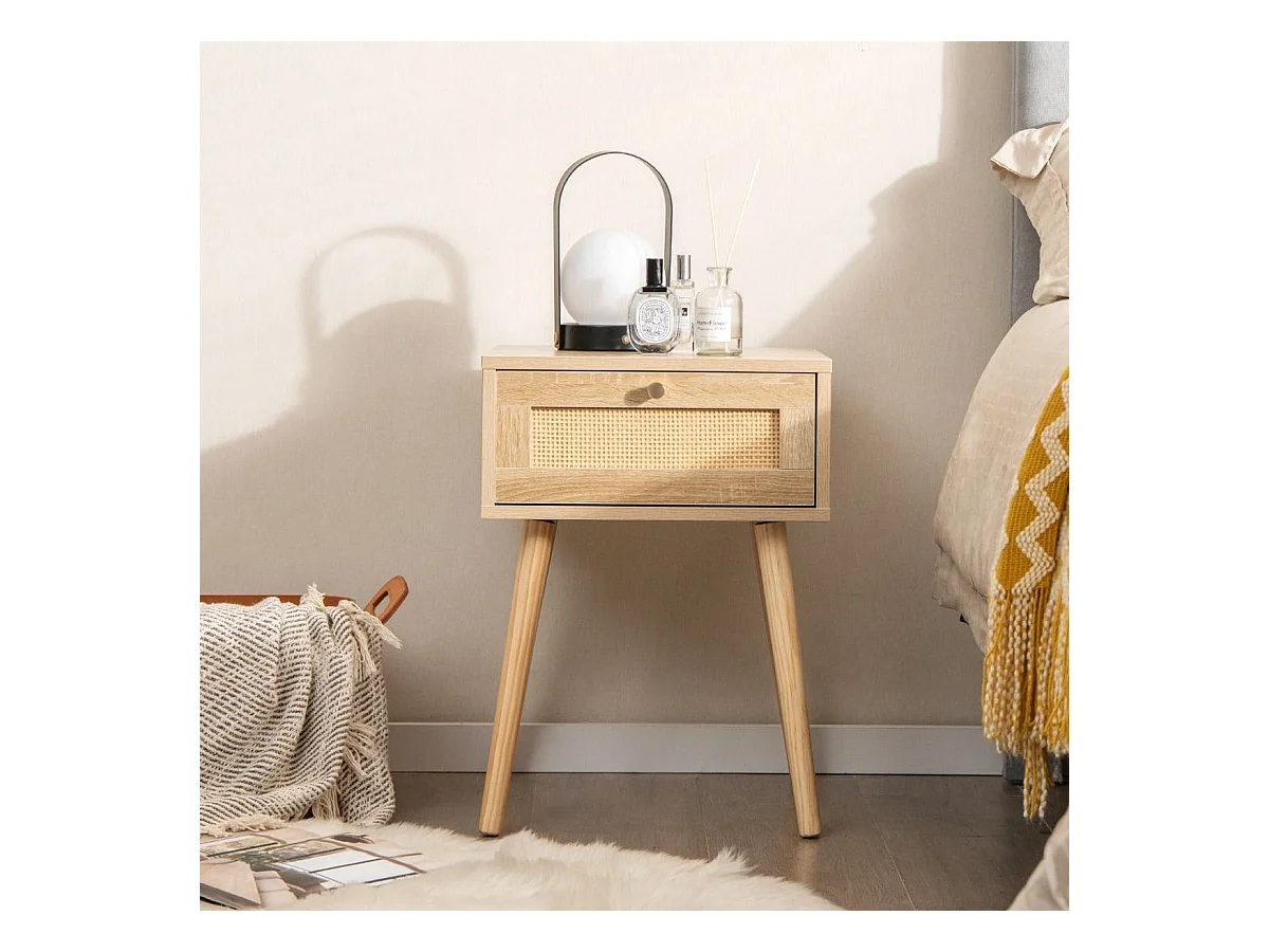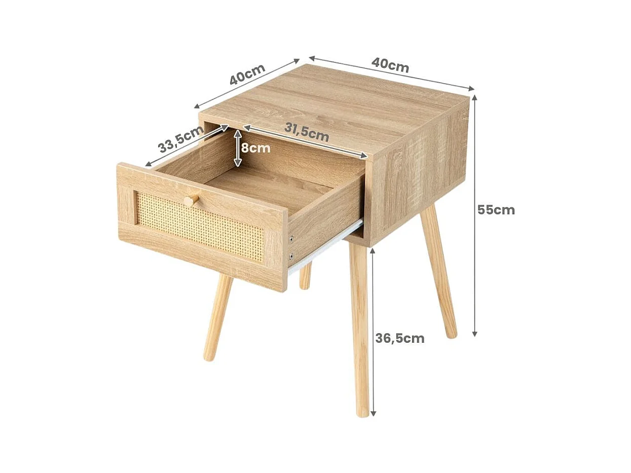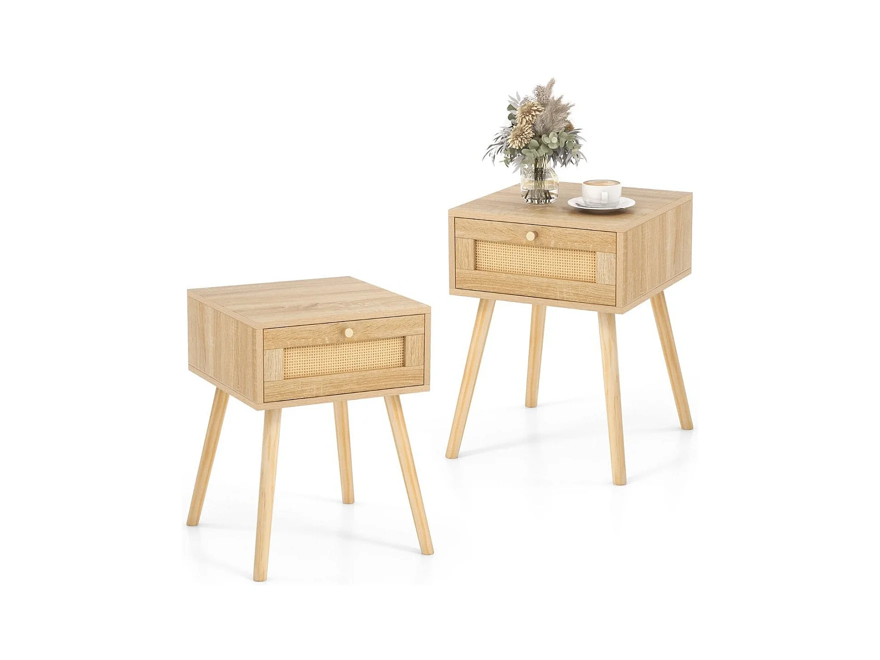 Set di 2 Comodini in rattan con decorazione intrecciata a mano, Tavolini da letto boho in legno stile mid-century Naturale