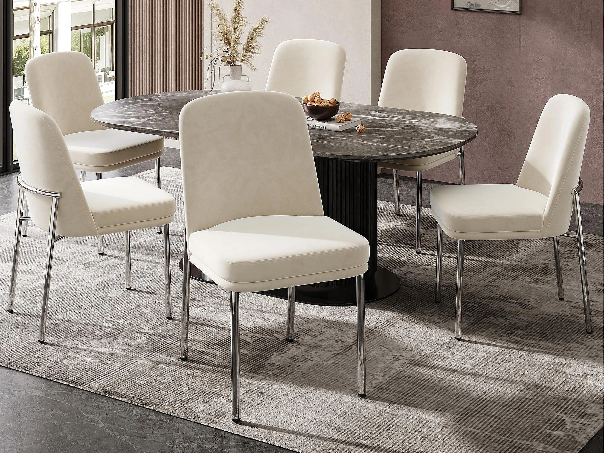 Set di 6 sedie da pranzo - con cuscini del sedile imbottiti - gambe di sedia in metallo argentato - Tessuto in velluto - Beige