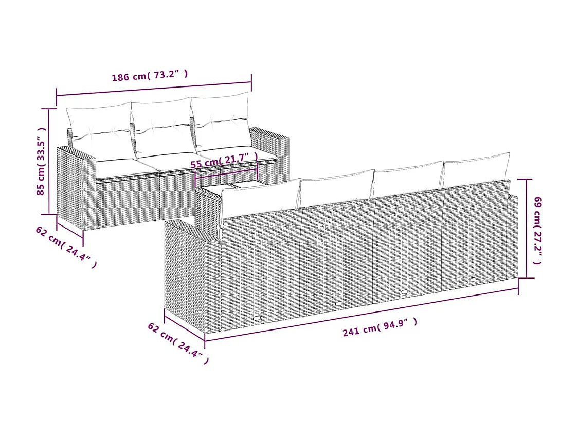 Set mobili da giardino con cuscini 9 pezzi in vimini marrone resina