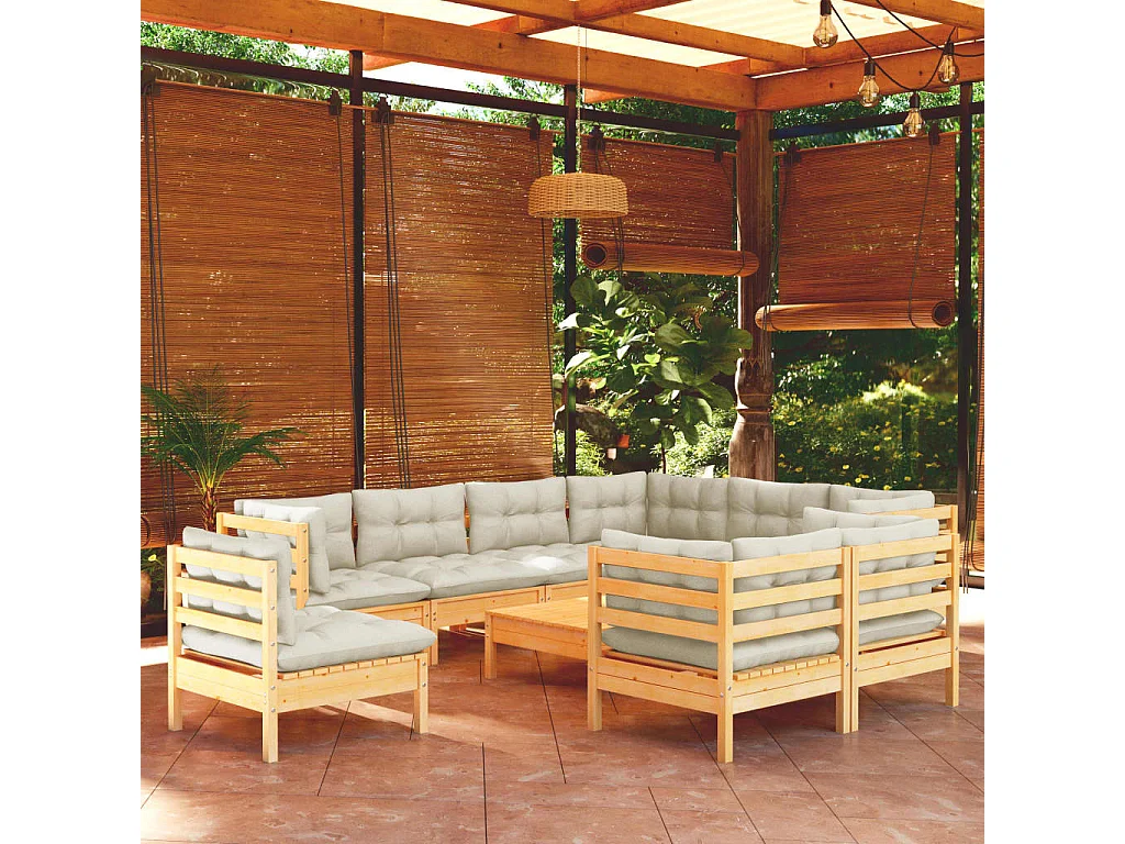 Set Divani da Giardino 10 pz con Cuscini Crema Massello di Pino